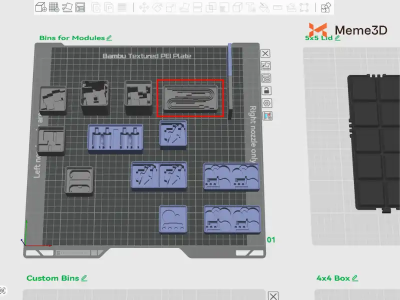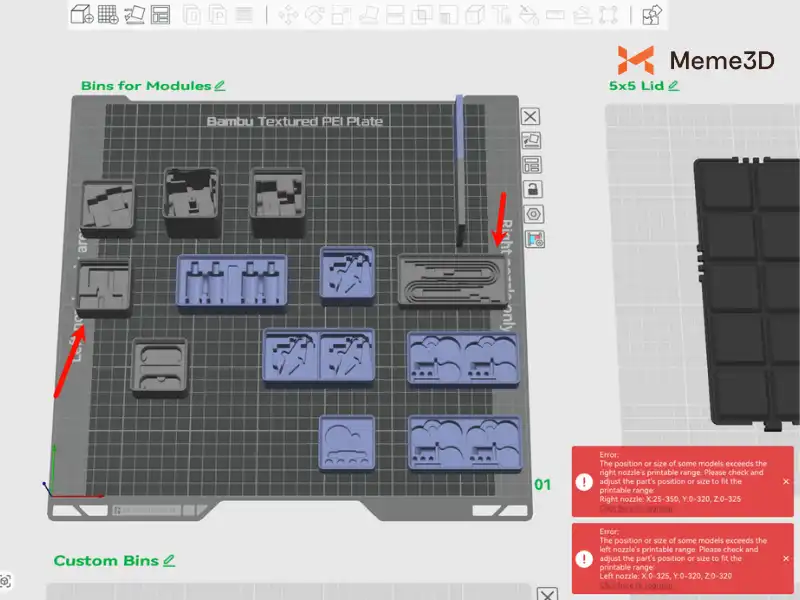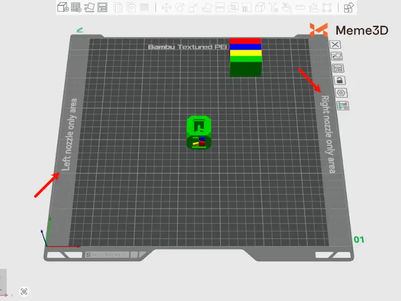 Hình ảnh xem trước bản in của Bambu Studio, các ký hiệu ở bên trái và bên phải cho biết “Khu vực chỉ sử dụng vòi phun bên trái” và “Khu vực chỉ sử dụng vòi phun bên phải”. Điều này có nghĩa là khi mô hình được đặt trong một trong hai khu vực “chỉ sử dụng một vòi phun” này, chỉ có vòi phun bên trái hoặc bên phải mới có thể được sử dụng để in.