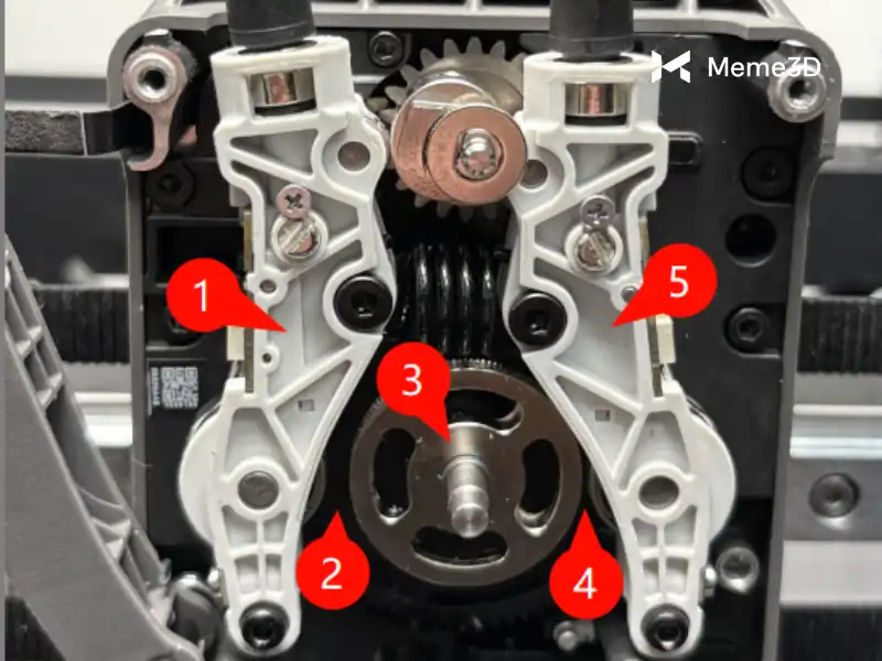 Khi vòi phun bên trái ở vị trí in, các tay đòn dẫn hướng của máy đùn sẽ ở vị trí bên phải, ép sợi nhựa cho vòi phun bên trái vào bánh răng đùn ở giữa để cho phép nó được đùn ra. Khi vòi phun bên trái ở vị trí hướng lên để cho phép vòi phun bên phải in, các tay đòn dẫn hướng của máy đùn sẽ ở vị trí bên trái để ăn khớp sợi nhựa bên phải với bánh răng đùn, như hình ảnh bên dưới.