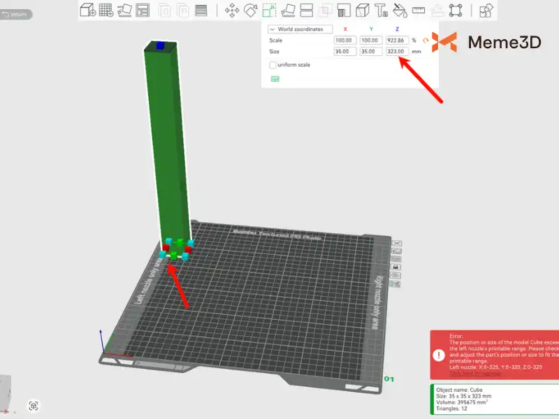Lưu ý rằng nếu chiều cao của mô hình vượt quá chiều cao in được của vòi phun bên trái (ví dụ: 324mm), thì mô hình chỉ có thể được in bằng vòi phun bên phải, ngay cả khi nó được đặt ở khu vực giữa.