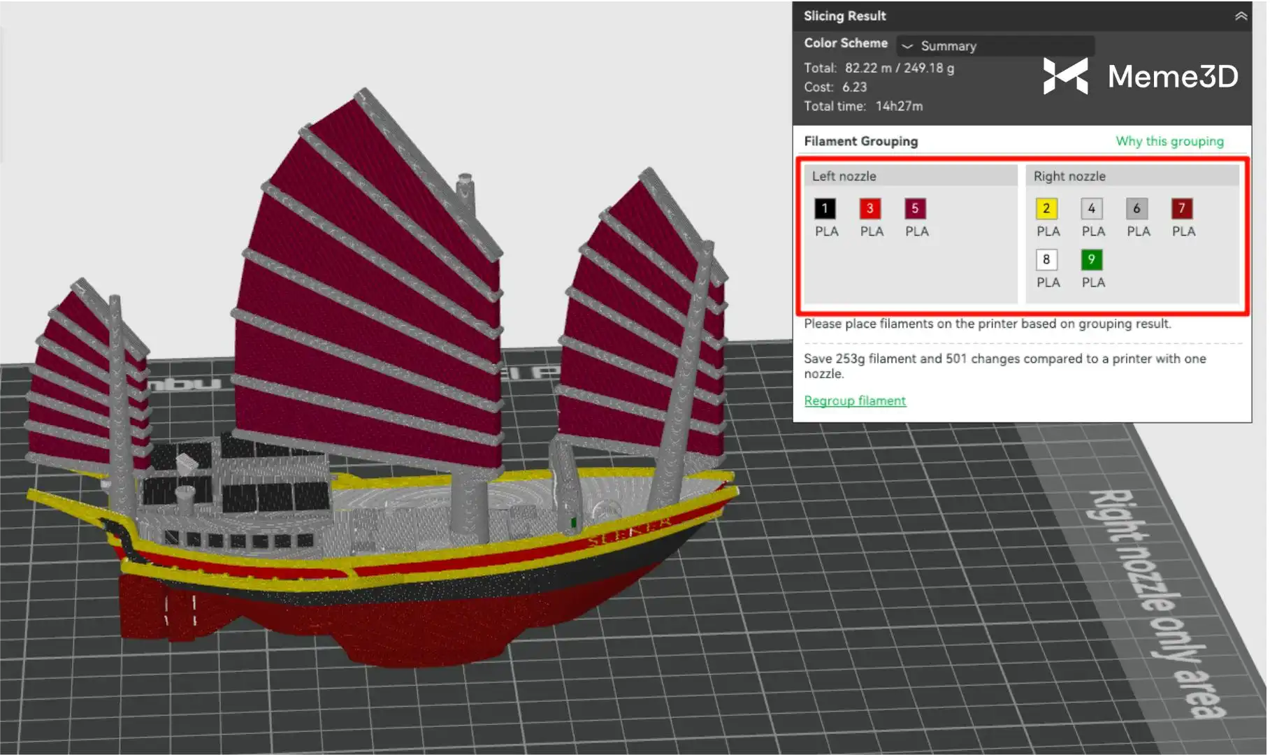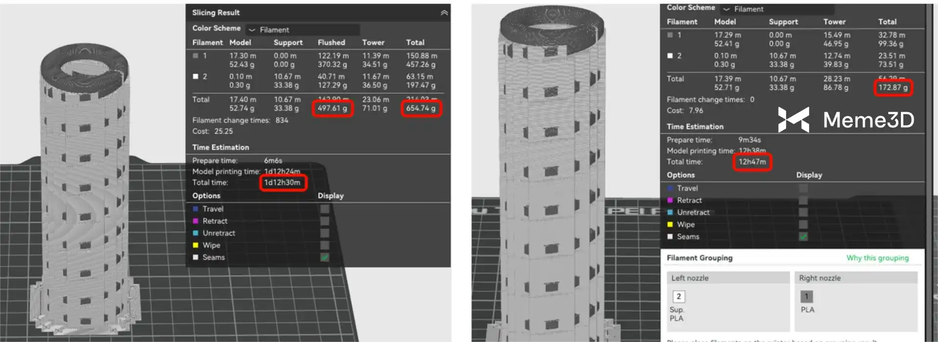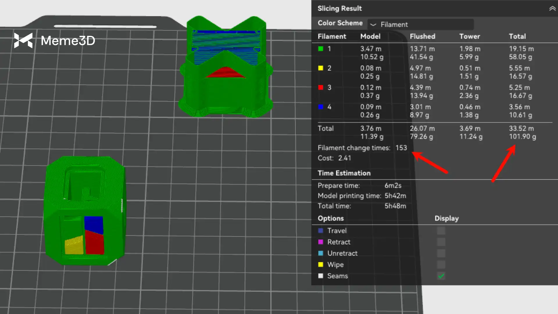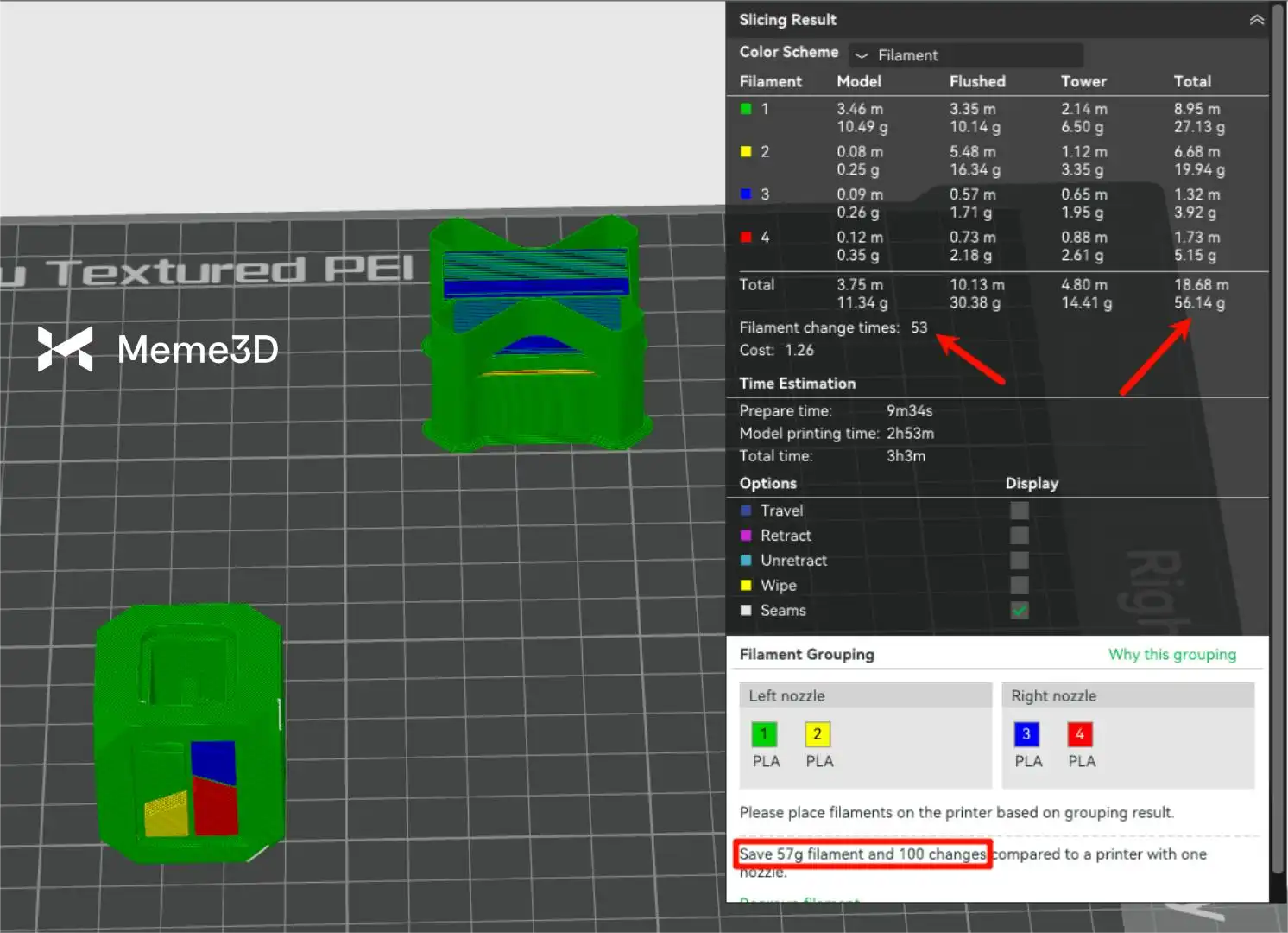 Nếu chúng ta in cùng một khối lập phương với cùng các thiết lập bằng cách sử dụng hai vòi phun của máy in H2D, chúng ta có thể thấy rằng chúng ta đã tránh được 100 lần thay sợi nhựa (giảm hơn 60%) và giảm tổng chi phí in gần 50%!