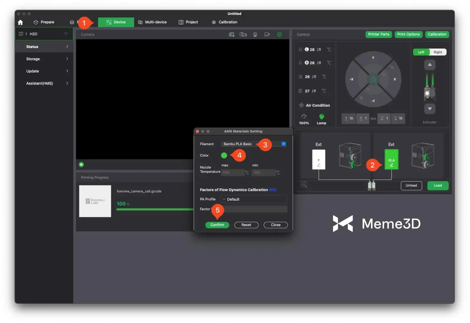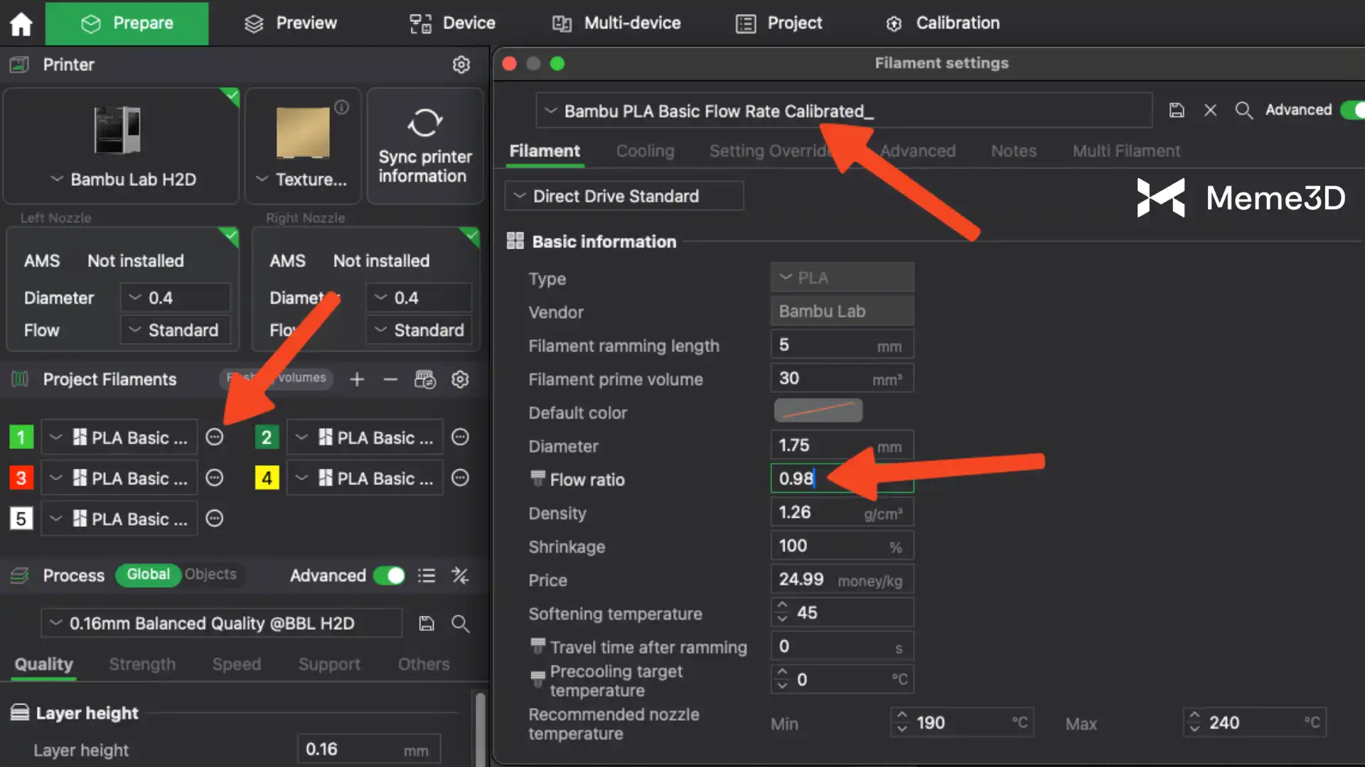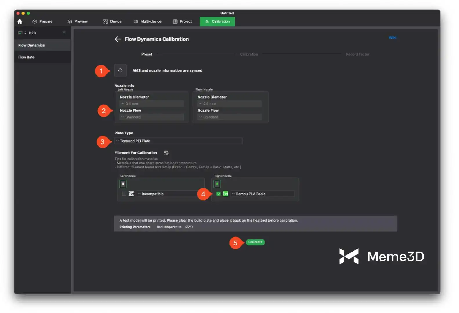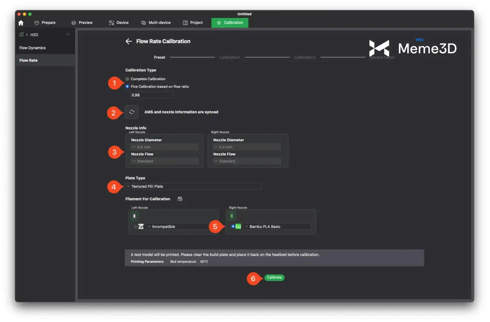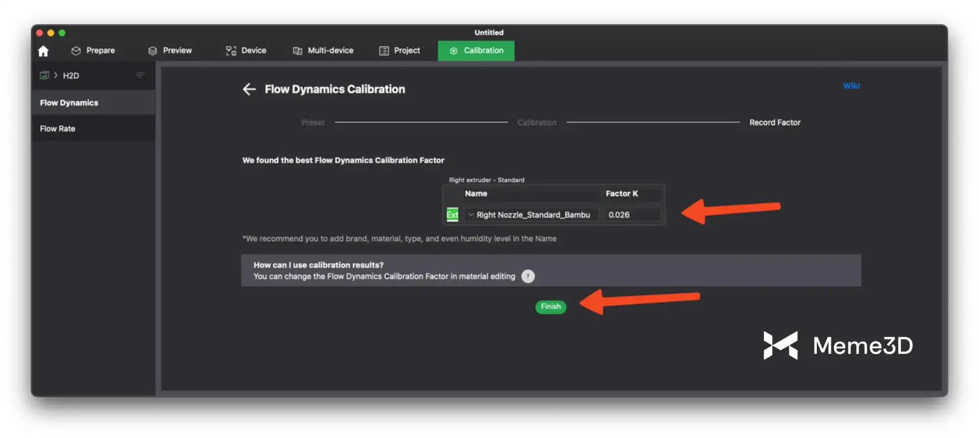 - Chuyển sang loại hoặc thương hiệu sợi in mới : Hệ thống điều chỉnh dòng chảy tự động H2D hoạt động tốt với sợi in Bambu Lab khi sử dụng các cấu hình được thiết lập sẵn trong Bambu Studio. Tuy nhiên, sợi in của bên thứ ba có thể có các đặc tính khác nhau (ví dụ: đường kính, độ nhớt) và việc hiệu chỉnh tốc độ dòng chảy đảm bảo quá trình đùn sợi diễn ra nhất quán. Có thể cần tinh chỉnh thủ công để đạt được kết quả tối ưu với các loại sợi in không phải của Bambu, đặc biệt là đối với các bản in chính xác.