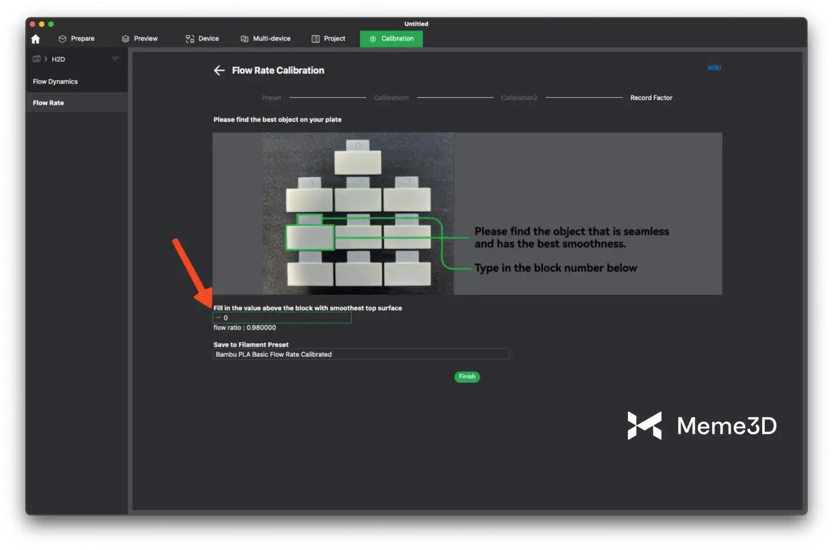 Trong Bambu Studio, chọn mẫu có độ mịn cao nhất, trong trường hợp này là số 0, sau đó đặt tên cho thiết lập sẵn của sợi filament. Quá trình hiệu chỉnh được hoàn tất bằng cách nhấp vào Finish.