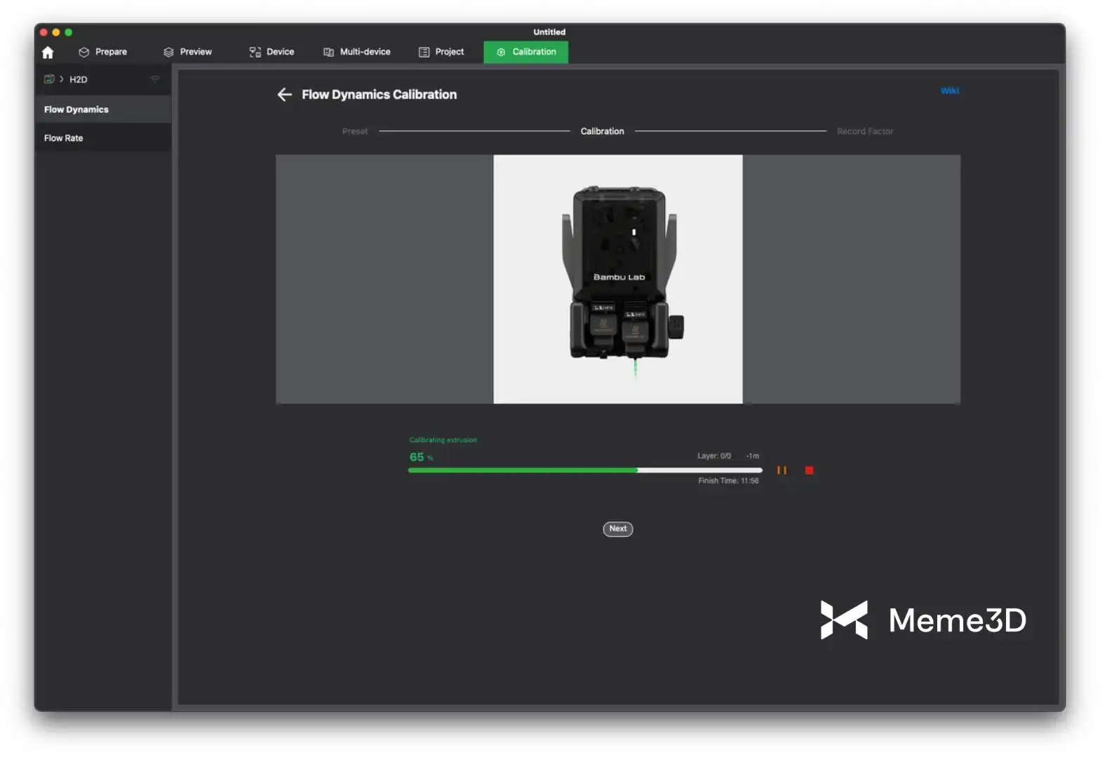 Sau khi bạn nhấp vào Calibrate (Hiệu chỉnh) , máy in sẽ bắt đầu hiệu chỉnh sợi nhựa tự động bằng cách cấp sợi nhựa qua vòi phun với tốc độ khác nhau và đo áp suất vòi phun một cách cẩn thận. Bạn chỉ cần đợi máy in hoàn thành công việc, sau đó chuyển sang bước tiếp theo.