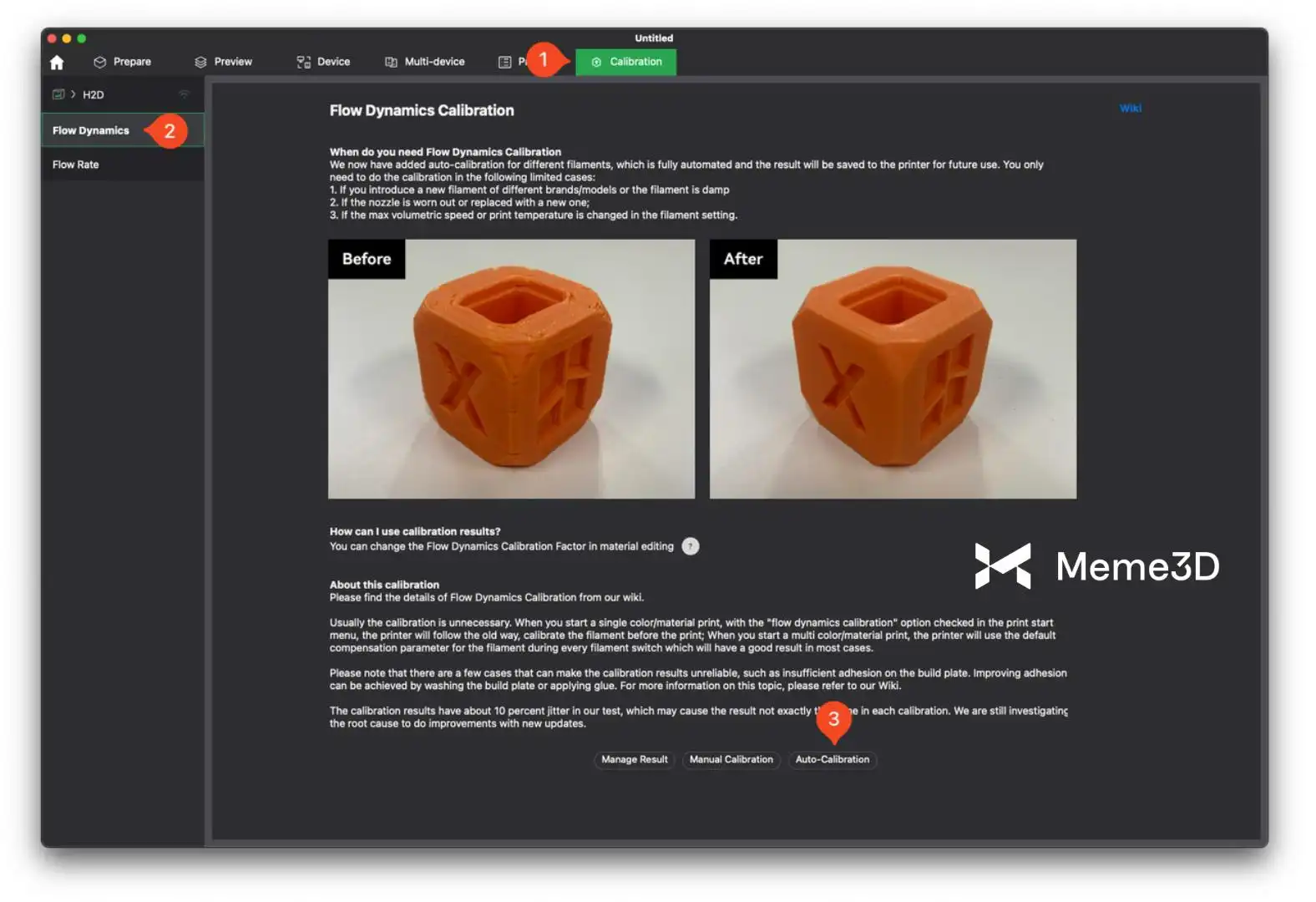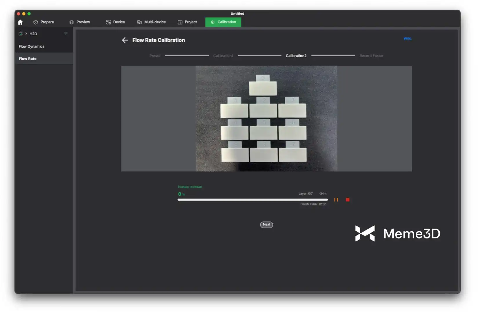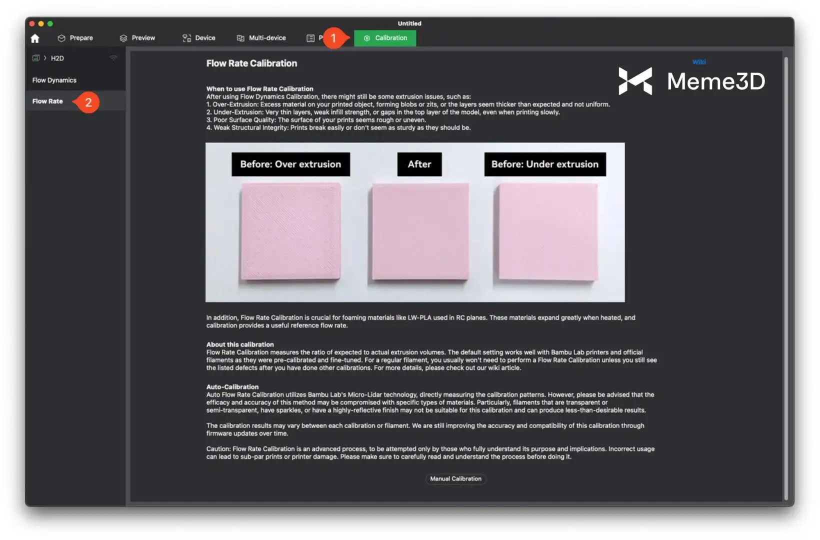 Việc hiệu chuẩn tốc độ dòng chảy được thực hiện sau khi đã thực hiện phân tích động lực dòng chảy, tấm in đã được làm sạch và lắp lại vào máy in. Để bắt đầu, chỉ cần điều hướng đến tab Hiệu chuẩn > Tốc độ dòng chảy , sau đó nhấp vào Hiệu chuẩn thủ công.