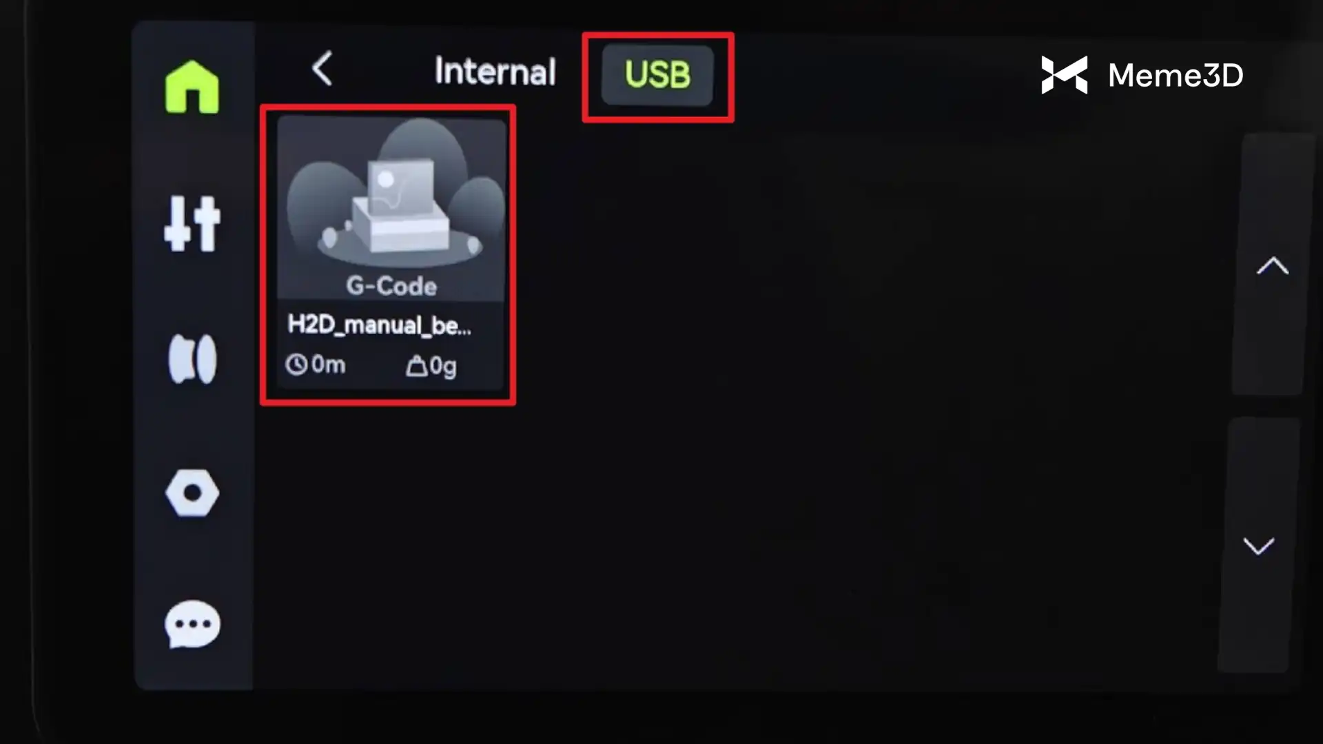 Tải xuống tệp mã G đi kèm và sao chép nó vào ổ USB. h2d_manual_bed_screws_adjust_assistv2.gcode .