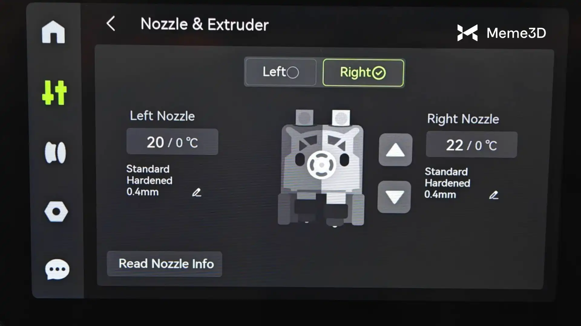 Bạn cần chuyển cụm vòi phun bên tría sang vòi phun bên phải để tránh va chạm khi điều chỉnh các vít bàn nhiệt. Để làm điều này, hãy vào phần Điều khiển và nhấp vào Vòi phun & Bộ đùn . Sau đó, chọn tùy chọn Bên phải.