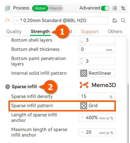 Tùy chọn Lớp lấp đầy thưa (có sẵn trong tab Độ bền ) thể hiện cấu trúc bên trong lấp đầy không gian bên trong một bộ phận được in, cung cấp sự hỗ trợ và độ bền mà không làm cho bộ phận đó trở nên đặc.