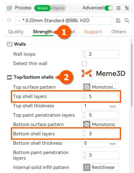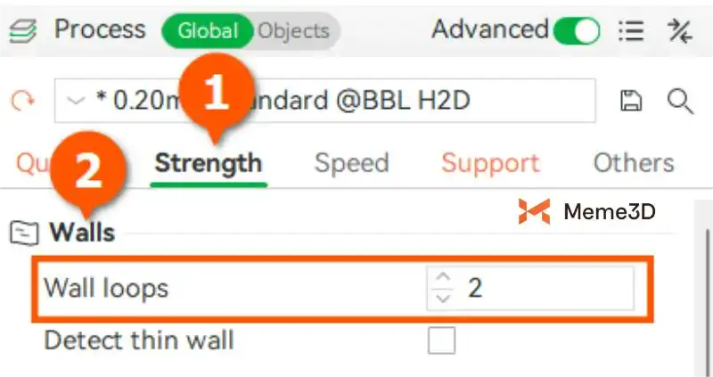 Trong Bambu Studio, bạn có thể sử dụng tùy chọn Wall Loops (có sẵn trong tab Strength ), tùy chọn này đề cập đến các đường viền ngoài cùng của mỗi lớp in và tạo thành phần lớn lớp vỏ ngoài của mô hình.