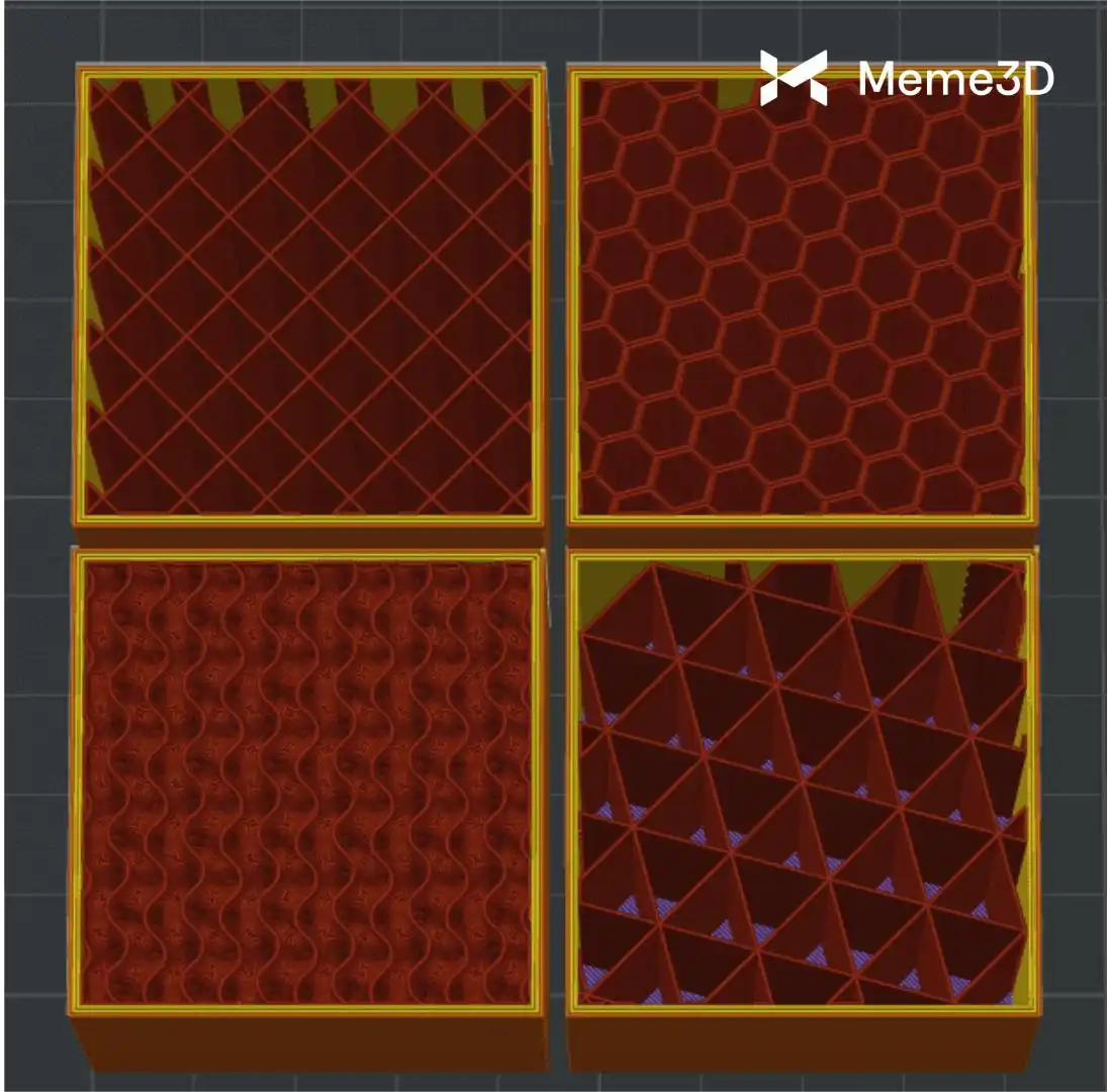 Mỗi kiểu cấu trúc đều có những đặc tính riêng biệt: ví dụ, kiểu tổ ong và kiểu xoắn ốc mang lại tỷ lệ độ bền trên trọng lượng tốt, trong khi kiểu lưới và kiểu tam giác cung cấp khả năng hỗ trợ cấu trúc đơn giản với tốc độ nhanh hơn.