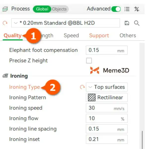 Bạn có thể điều chỉnh các cài đặt ủi trong Bambu Studio, từ tab Chất lượng.