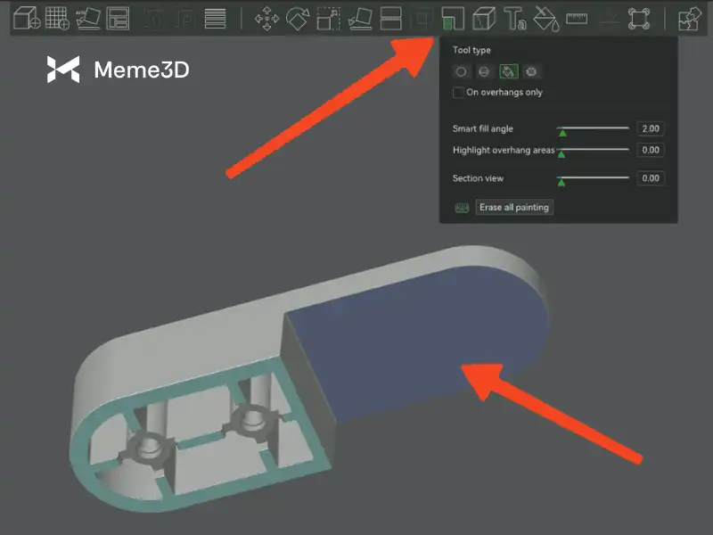Một trong những tính năng hữu ích nhất để hỗ trợ in 3D trong Bambu Studio là Tô màu hỗ trợ (Support Painting). Với tùy chọn này, bạn có thể tô màu các phần trên mô hình nơi bạn muốn tạo ra cấu trúc hỗ trợ, trong ví dụ này, được đánh dấu bằng màu tím. Với Tô màu hỗ trợ, bạn có thể giảm thiểu lượng sợi nhựa cần dùng cho việc tạo cấu trúc hỗ trợ.