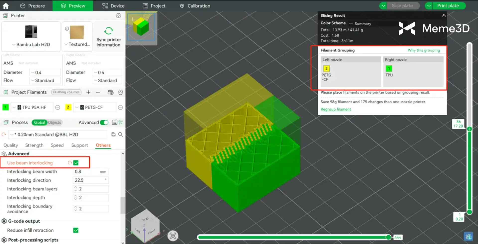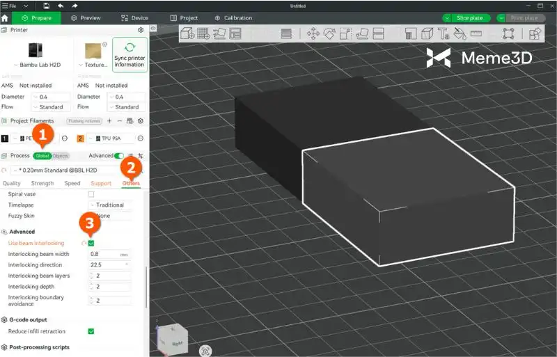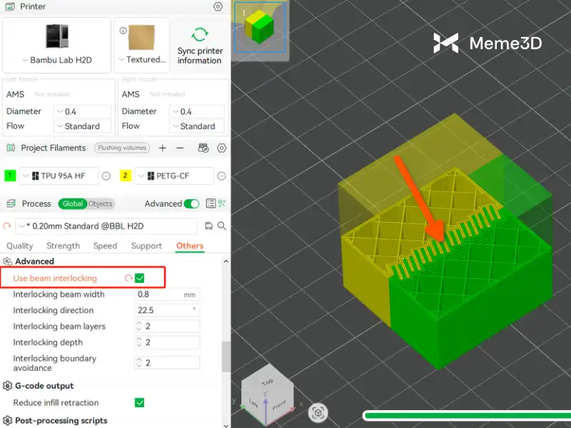Máy in 3D Bambu Lab H2D cho phép bạn kết hợp các vật liệu không tương thích trên cùng một mô hình, chẳng hạn như sợi nhựa cứng và mềm, bằng cách sử dụng các tính năng tiên tiến trong phần mềm Bambu Studio. Ví dụ, bạn có thể ghép các sợi nhựa cứng như PETG-CF với sợi nhựa mềm TPU 95A HF, trong đó PETG-CF được nạp vào đầu phun bên trái và TPU vào đầu phun bên phải. Để đảm bảo tính tương thích, bạn cần bật tính năng ” Sử dụng Beam Interlocking ” trong Bambu Studio, tính năng này tạo ra cấu trúc liên kết để tăng cường độ bền liên kết giữa các vật liệu.