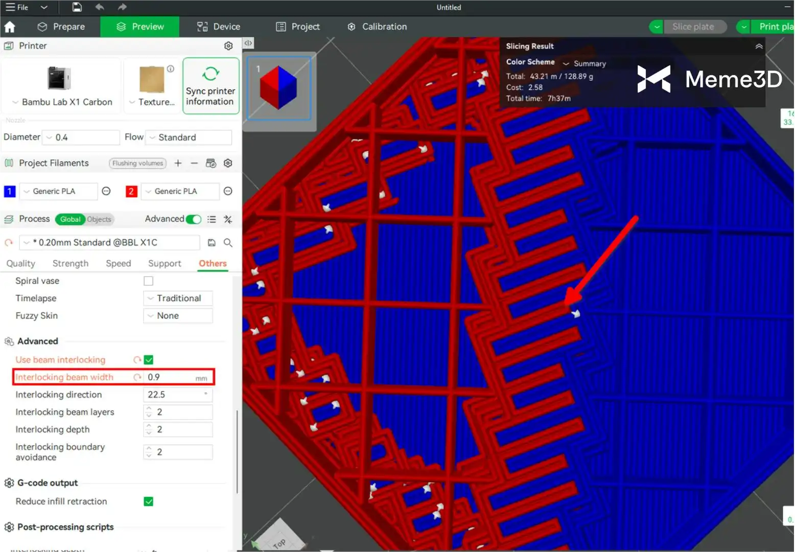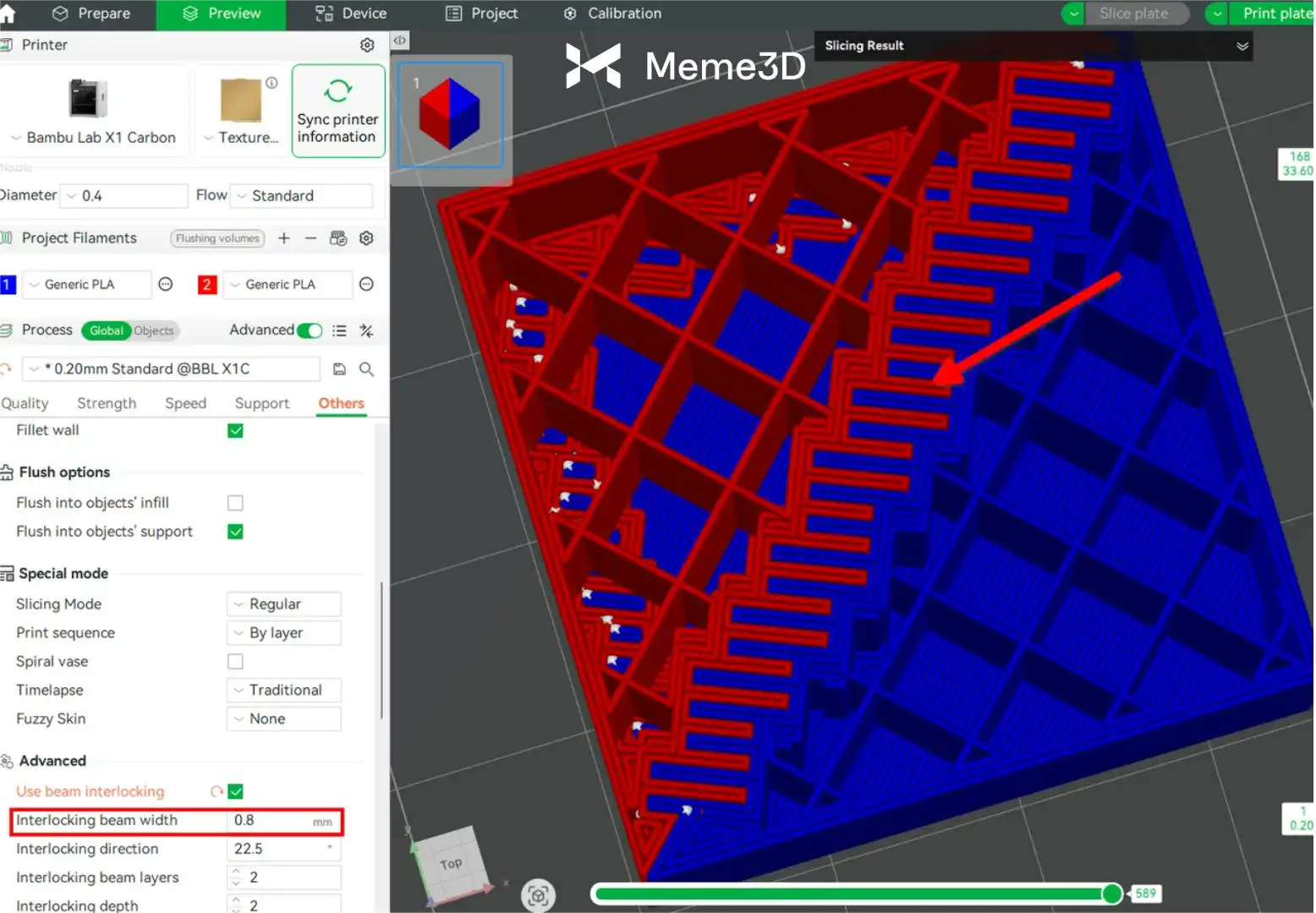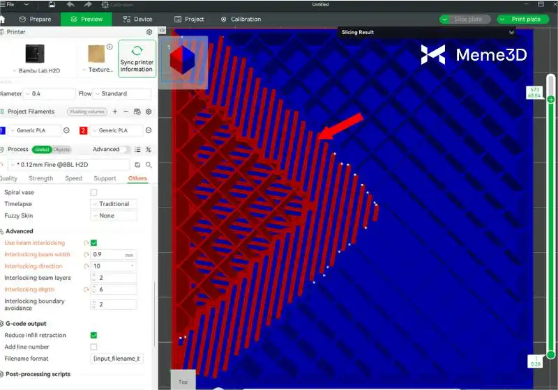 Việc sử dụng tính năng Beam Interlocking trong Bambu Studio giúp cải thiện liên kết giữa các sợi filament cứng và mềm. Tùy chọn này tự động thêm một cấu trúc khóa liên kết đặc biệt trong quá trình cắt lát, như hình ảnh bên dưới.