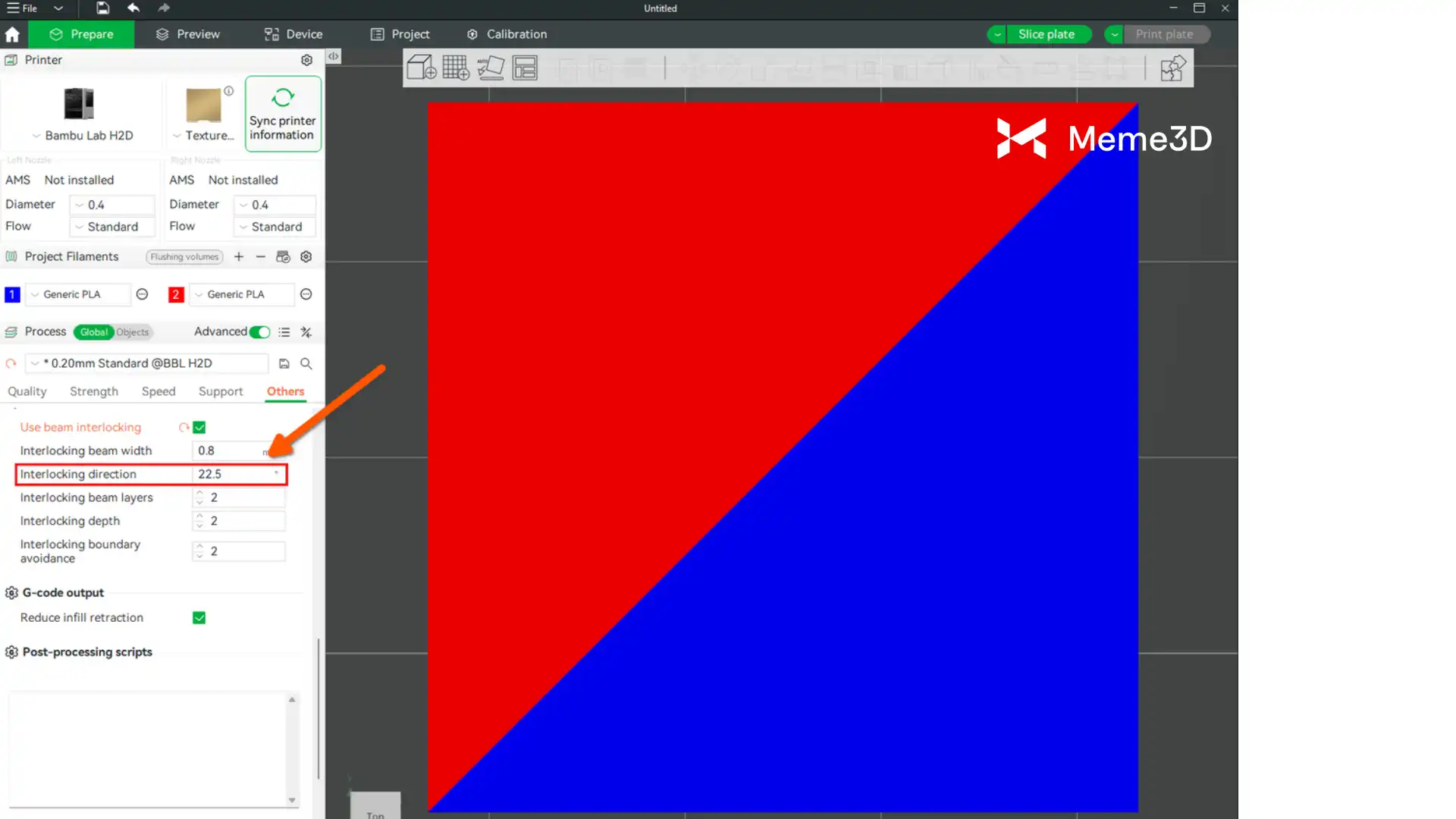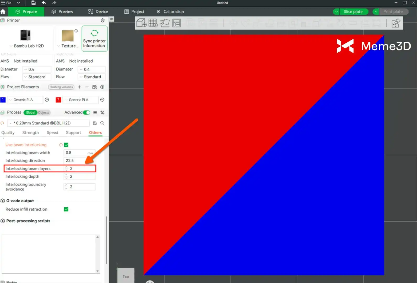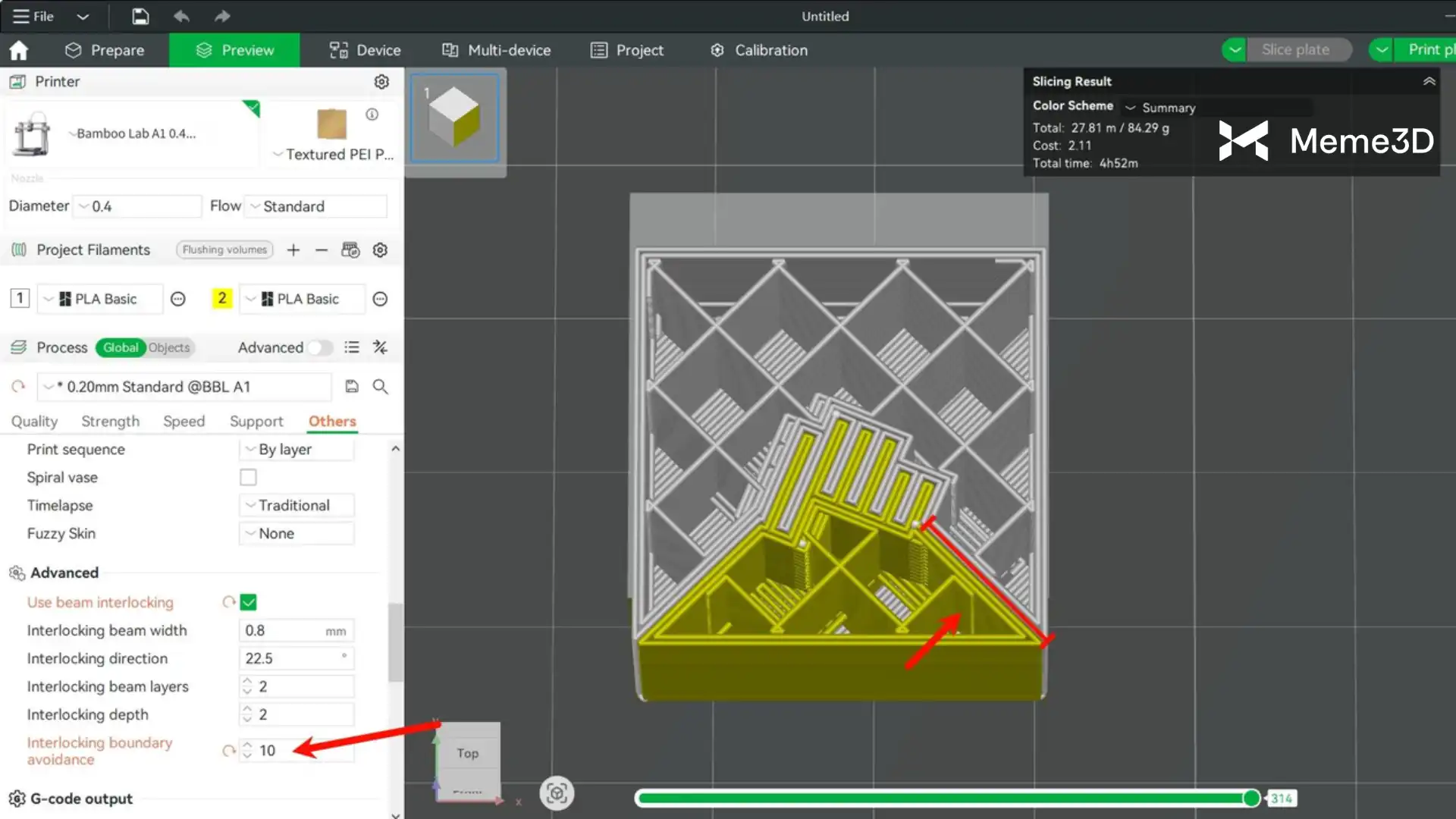 Việc sử dụng tính năng Beam Interlocking trong Bambu Studio giúp cải thiện liên kết giữa các sợi filament cứng và mềm. Tùy chọn này tự động thêm một cấu trúc khóa liên kết đặc biệt trong quá trình cắt lát, như hình ảnh bên dưới.