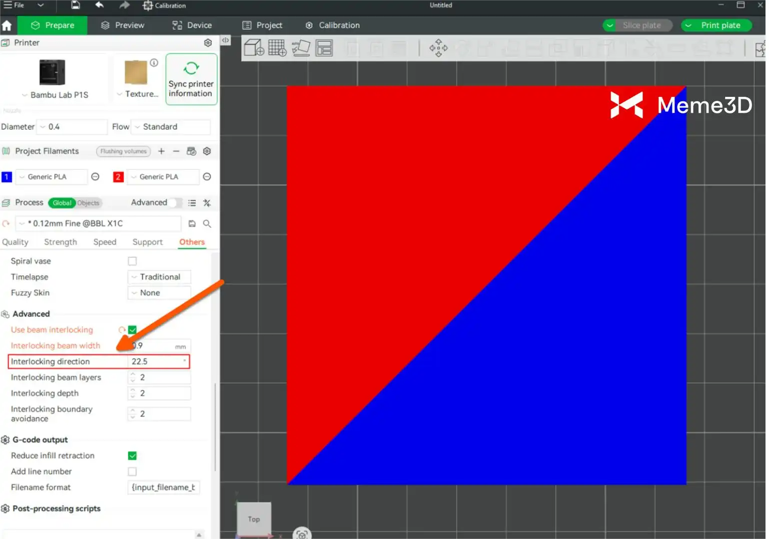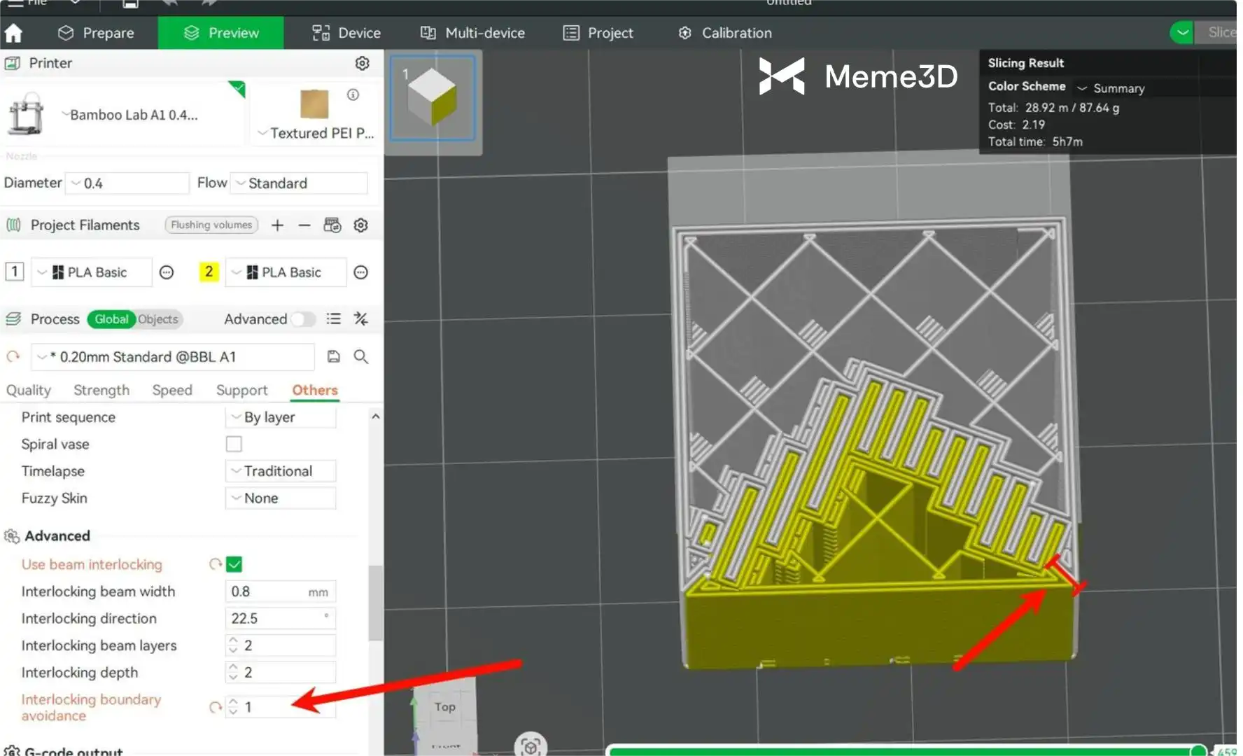- Liên kết đan xen (Beam interlocking): Bật tính năng “Beam Interlocking” trong phần mềm Bambu Studio để tăng cường độ bám dính giữa hai loại vật liệu. Thiết lập này giúp củng cố kết cấu mối nối cho các bản in sử dụng đa vật liệu không đồng nhất.