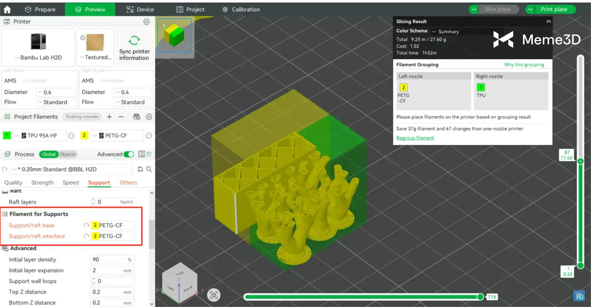 - Nếu mô hình cần giá đỡ, hãy đảm bảo rằng các sợi filament của giá đỡ và giao diện giá đỡ được thiết lập là sợi filament cứng (TPU không phù hợp để làm giá đỡ).