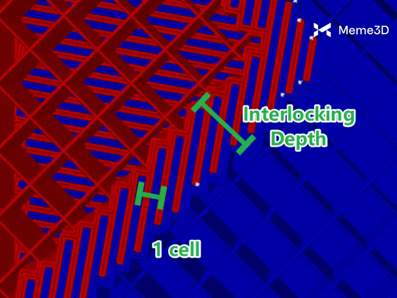Thiết lập này kiểm soát khoảng cách (tính theo đơn vị ô lưới) từ vị trí cấu trúc liên kết đan xen (interlocking infill) được tạo ra cho đến lớp vỏ ngoài của mô hình.
