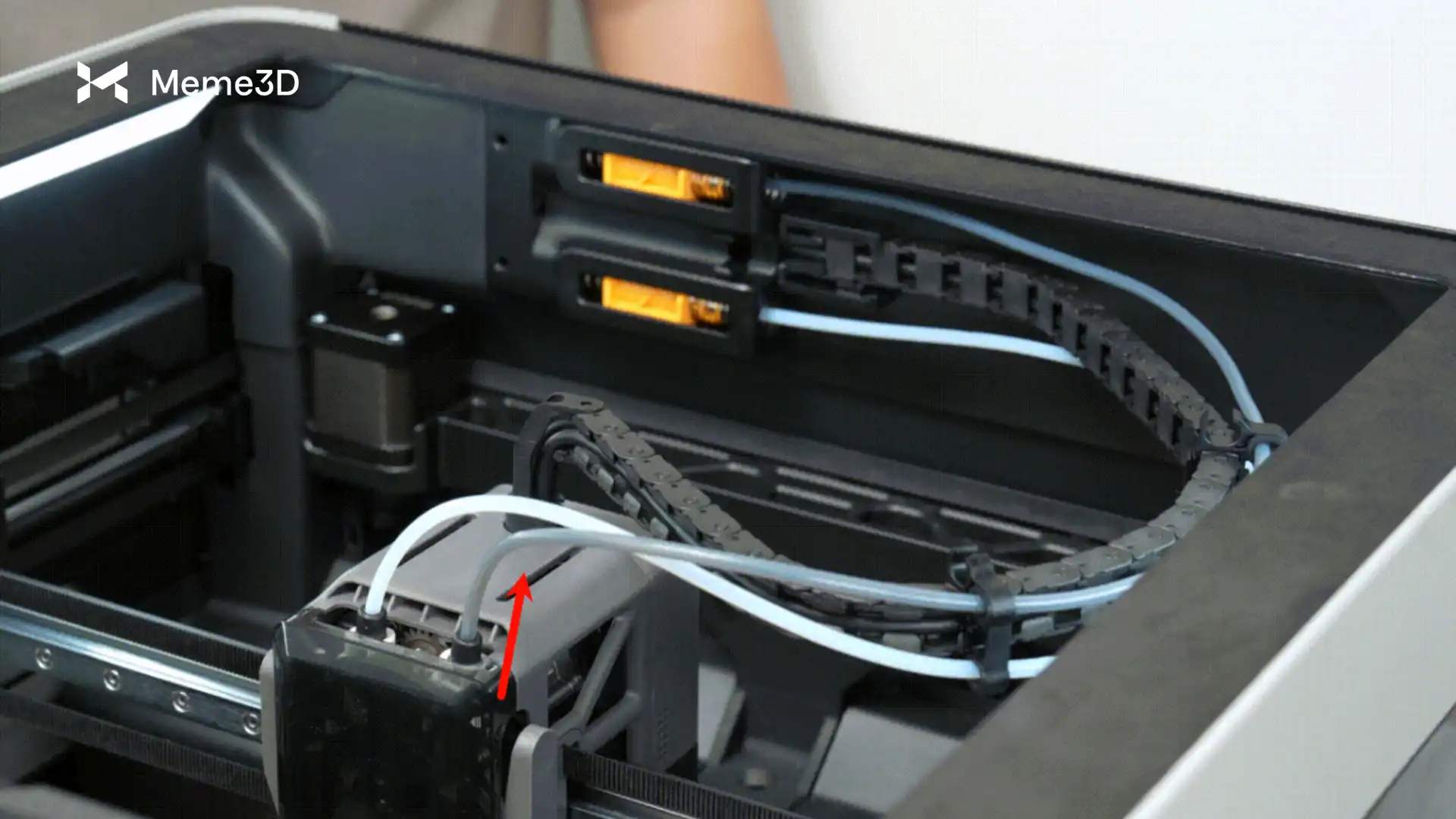 Vì ví dụ của chúng ta đang sử dụng đầu phun bên phải cho quá trình kéo nguội, nên trong khi chờ vòi phun đạt đến nhiệt độ cần thiết, chúng ta nên tháo ống PTFE cấp nhựa cho đầu phun bên phải.