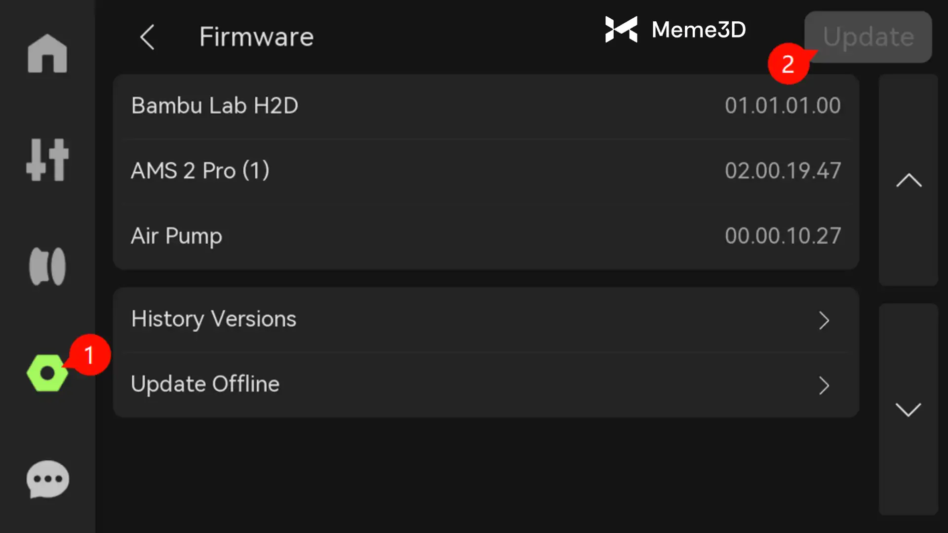 Để đạt hiệu suất tốt nhất, hãy đảm bảo rằng phần mềm H2D đã được cập nhật đầy đủ trước khi kết nối AMS 2 Pro hoặc AMS HT. Bạn có thể xem và cập nhật phiên bản phần mềm trong tab Cài đặt. Nếu có bản cập nhật, nút Cập nhật sẽ hoạt động ở góc trên bên phải. Điều này sẽ đảm bảo bạn được hưởng lợi từ bất kỳ tính năng bổ sung nào mà chúng tôi sẽ thêm vào theo thời gian.