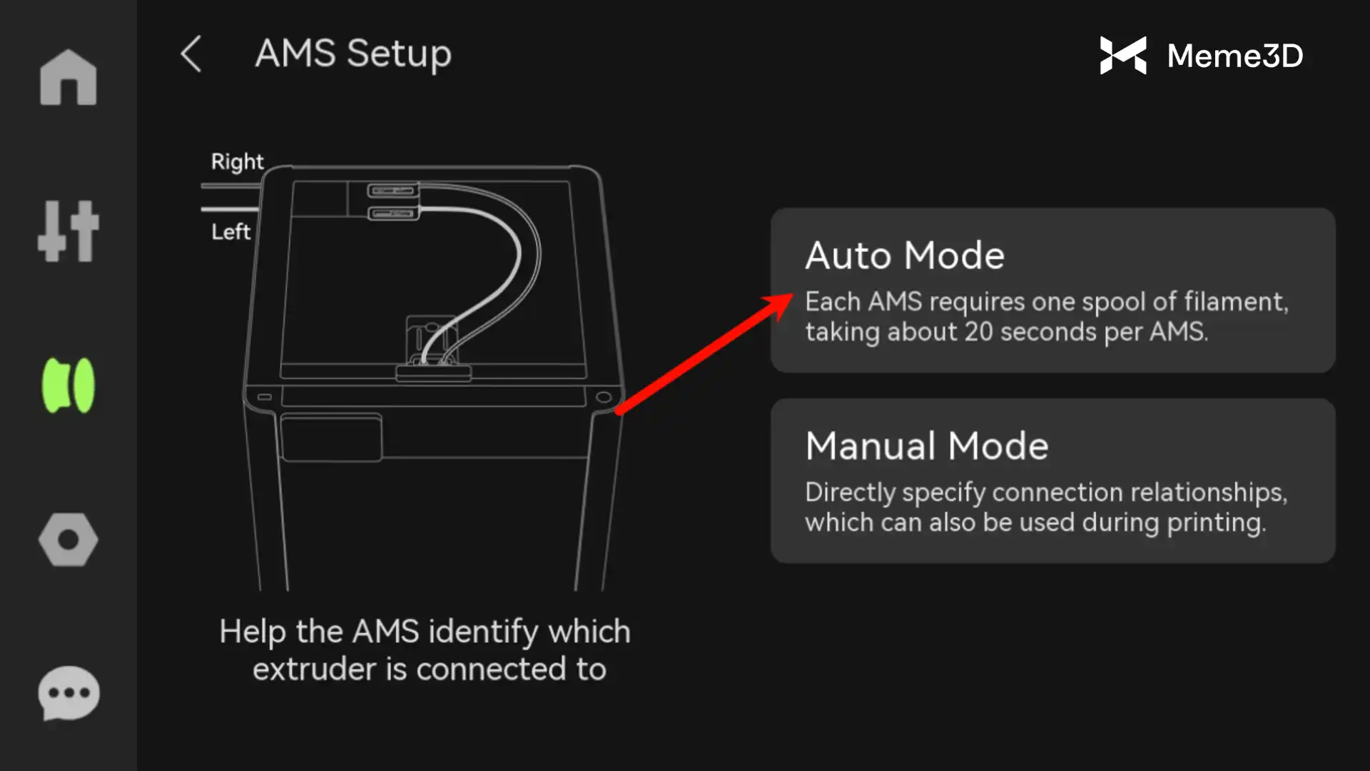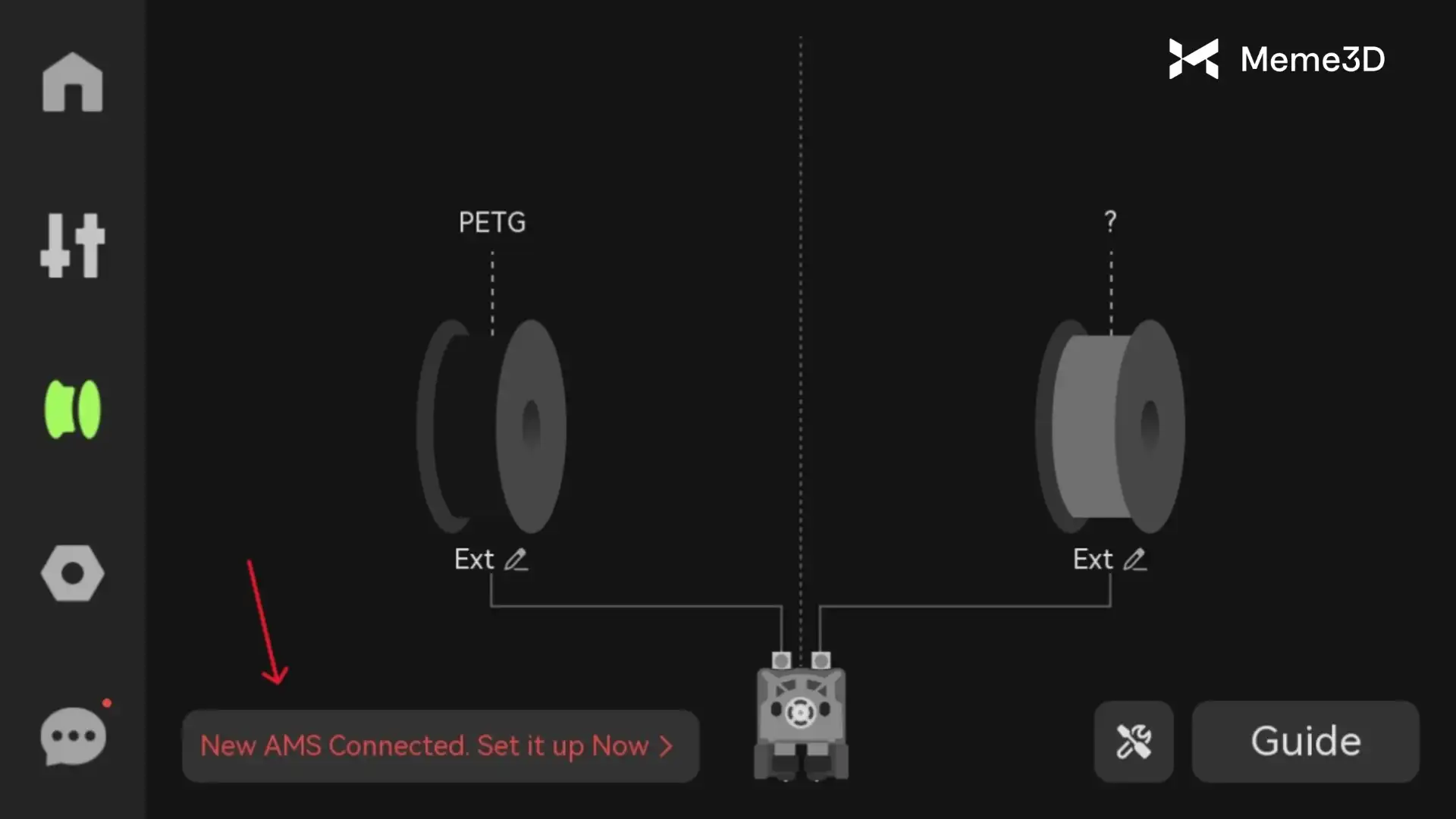 Máy in sẽ tự động phát hiện xem có thiết bị AMS nào được kết nối mới hay không. Hãy làm theo các bước hướng dẫn để khởi tạo thiết bị AMS nhằm kích hoạt cả chức năng đổi màu và sấy khô.