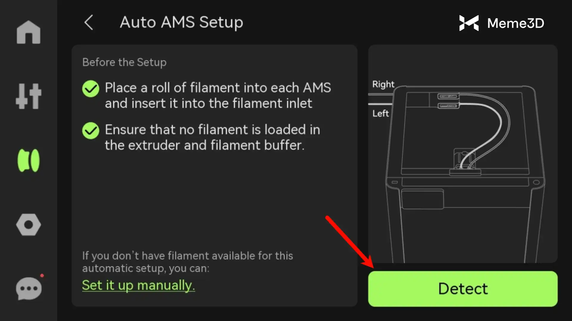 Chọn Detect sau khi bạn xác nhận sợi nhựa đã được nạp vào AMS, như mô tả trên màn hình.