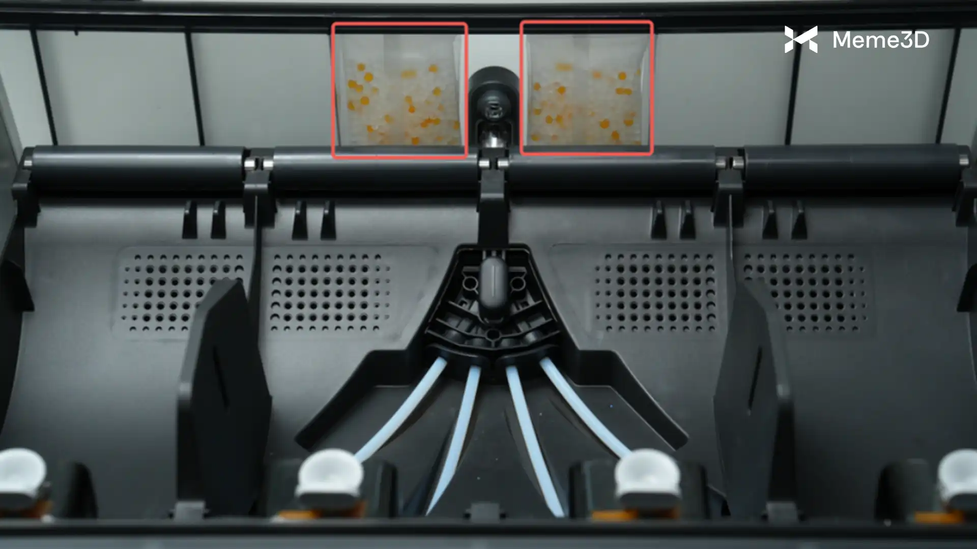 Lấy túi hạt màu trắng đục ra khỏi bao bì nhựa trong suốt và đặt các túi vào phần giữa phía sau của AMS 2 Pro, như hình minh họa bên dưới.