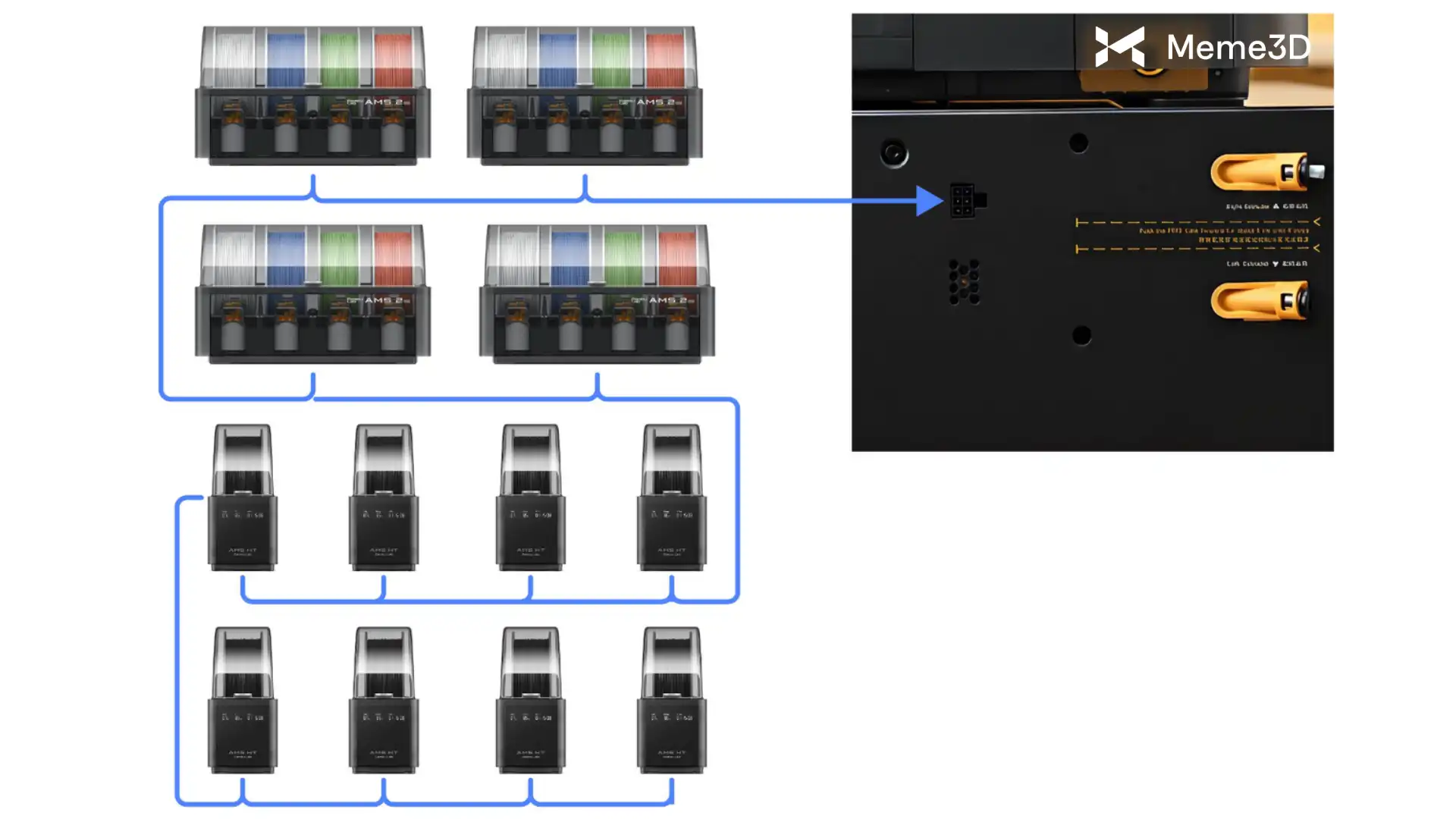 Lưu ý : Nếu kết nối hai thiết bị AMS 2 Pro với một máy H2D, mỗi thiết bị có thể được kết nối với một đầu vào của máy đùn. Để kết nối nhiều hơn một thiết bị AMS với một đầu vào máy đùn duy nhất, cần có bộ chuyển đổi PTFE .