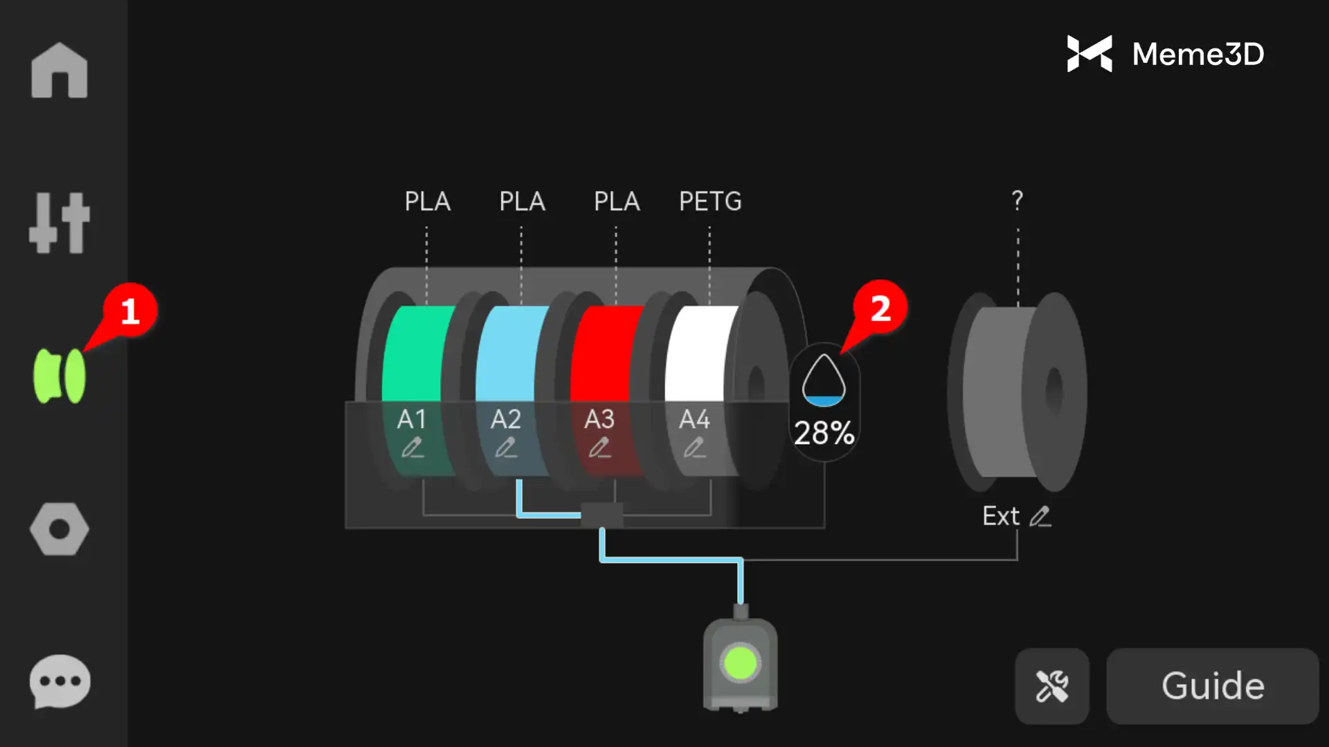 Tiếp theo, trên màn hình cảm ứng của máy in, điều hướng đến phần Sợi in (Filament ). Màn hình này sẽ hiển thị sơ đồ với từng bộ phận AMS được kết nối với H2D. Nhấp vào biểu tượng độ ẩm AMS cho bộ phận AMS đang được sử dụng để sấy khô. Thao tác này sẽ mở trang Sấy khô và Độ ẩm (Drying and Humidity).