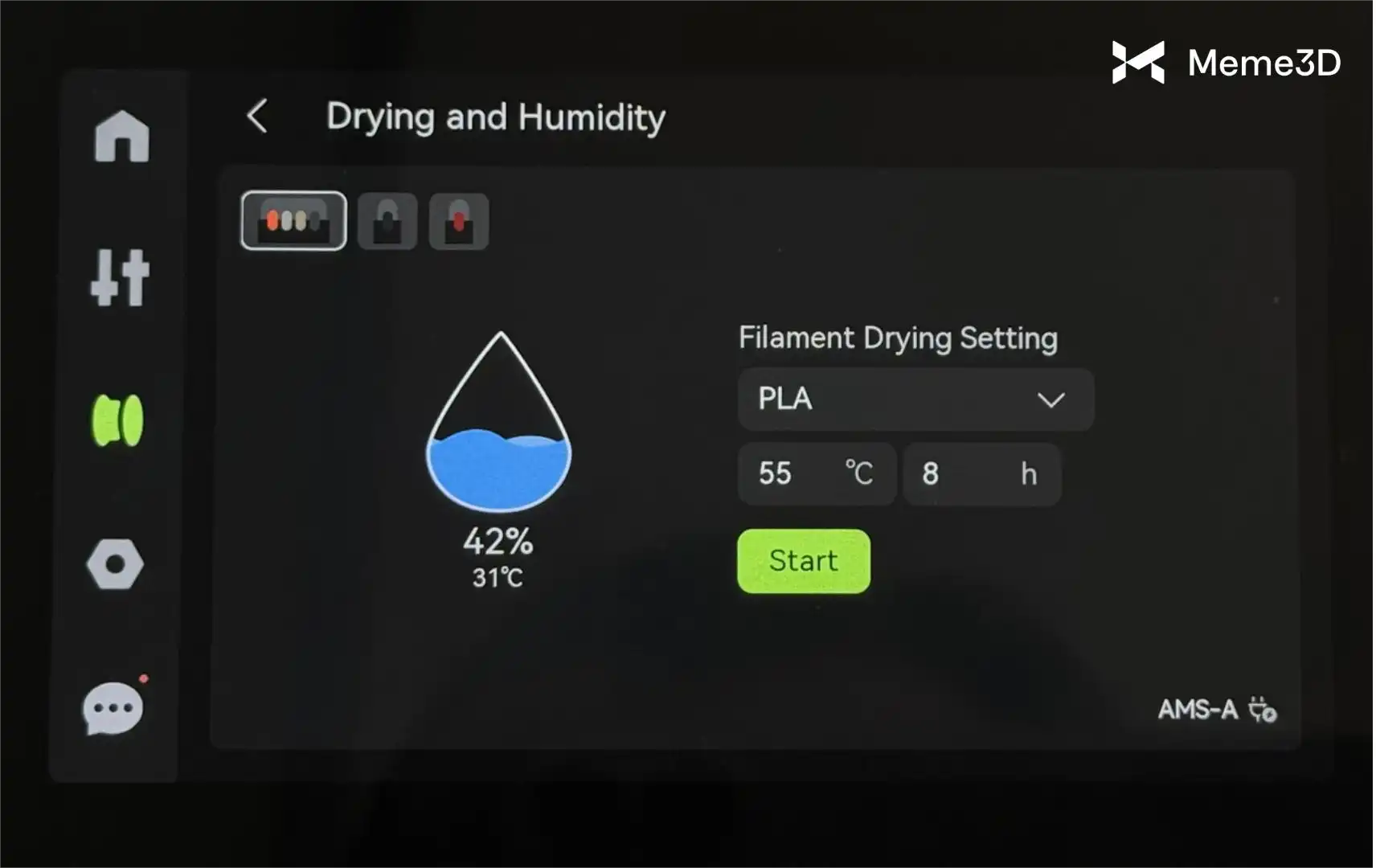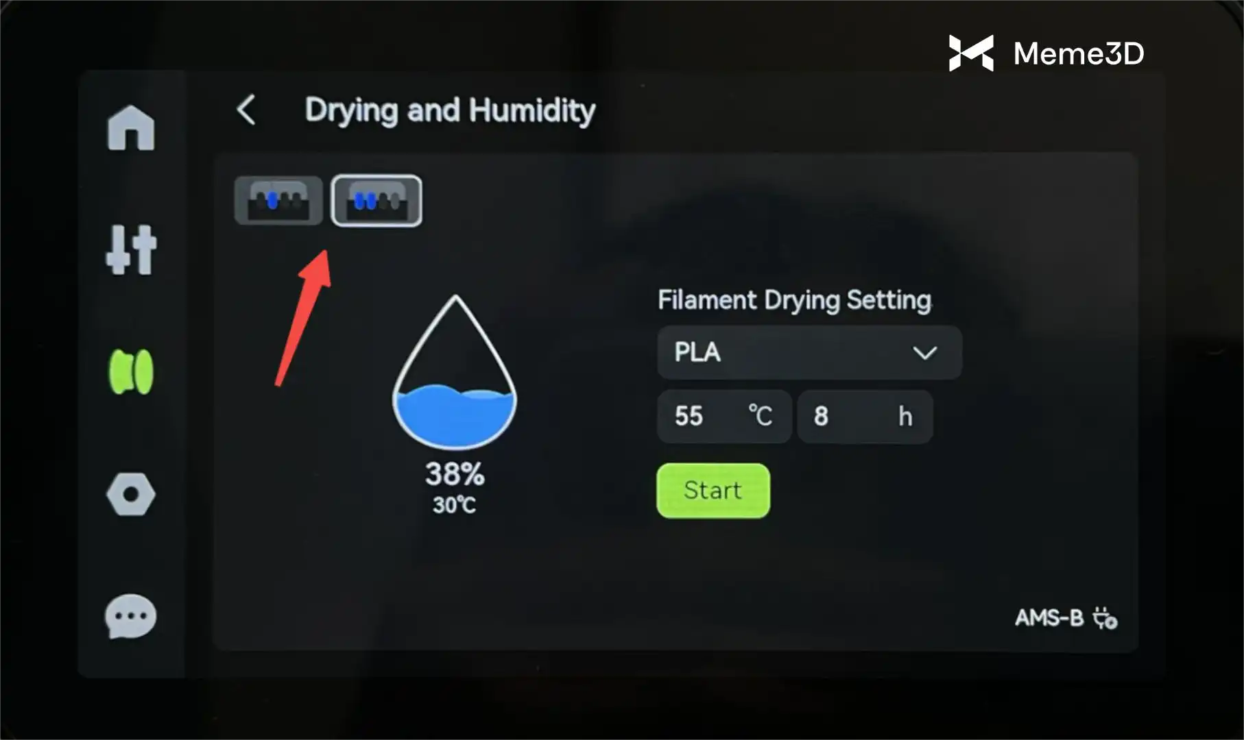 Ở phía trên bên trái, bạn có thể chọn (hoặc thay đổi lựa chọn) thiết bị AMS mà bạn muốn bắt đầu sấy.