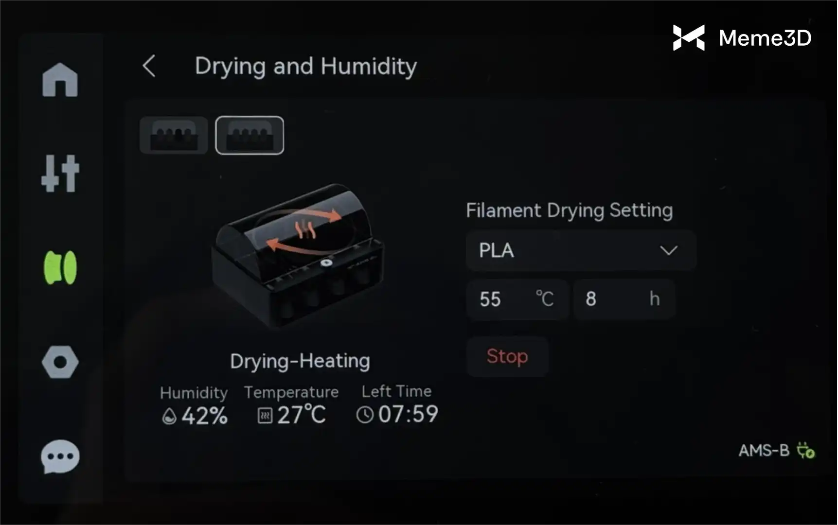 Bạn có thể theo dõi độ ẩm và nhiệt độ theo thời gian thực bằng cách nhấp vào góc trên bên trái. Nếu bạn đã kết nối nhiều thiết bị AMS, bạn cũng có thể sử dụng tùy chọn đó để chuyển đổi giữa các thiết bị AMS. Bạn sẽ có thể xem độ ẩm, nhiệt độ và thời gian còn lại.