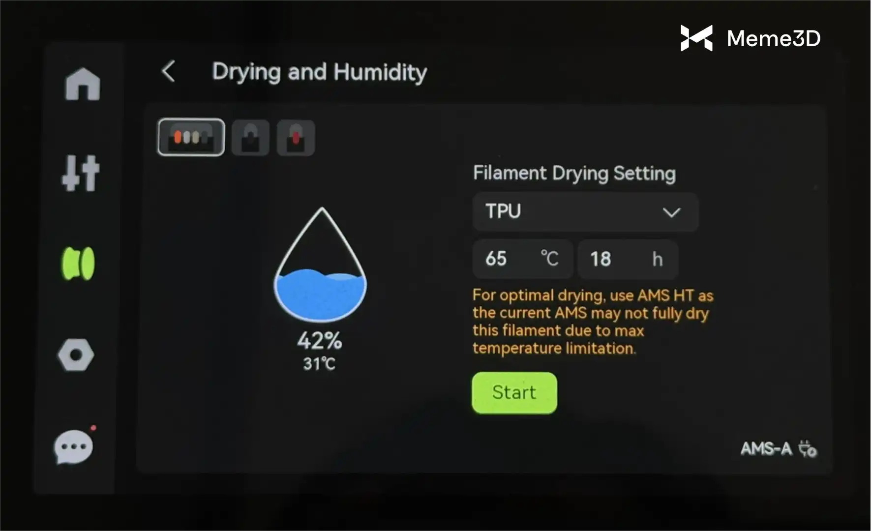 Máy sấy AMS 2 Pro có khả năng đạt nhiệt độ sấy tối đa 65 °C, đủ để sấy khô hiệu quả hầu hết các loại sợi in 3D. Tuy nhiên, một số loại sợi có thể cần nhiệt độ cao hơn 65 °C. Trong trường hợp này, bạn sẽ thấy thông báo đề nghị sử dụng máy sấy AMS HT (có thể đạt đến 85 °C).