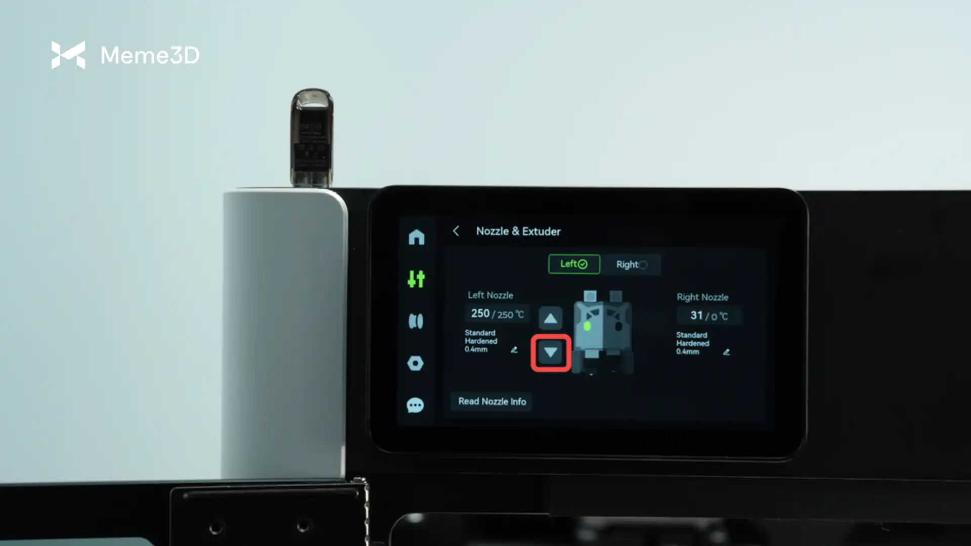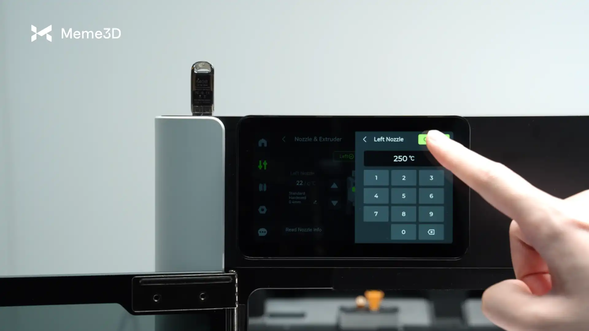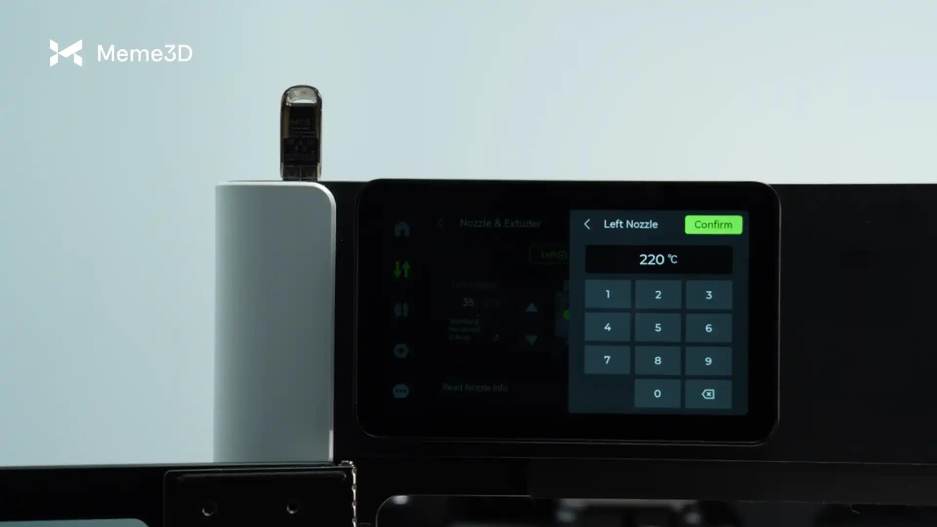 Đầu tiên, hãy làm nóng đầu phun đến 220°C đối với PLA hoặc cao hơn nếu bạn sử dụng loại sợi khác cần nhiệt độ cao hơn.