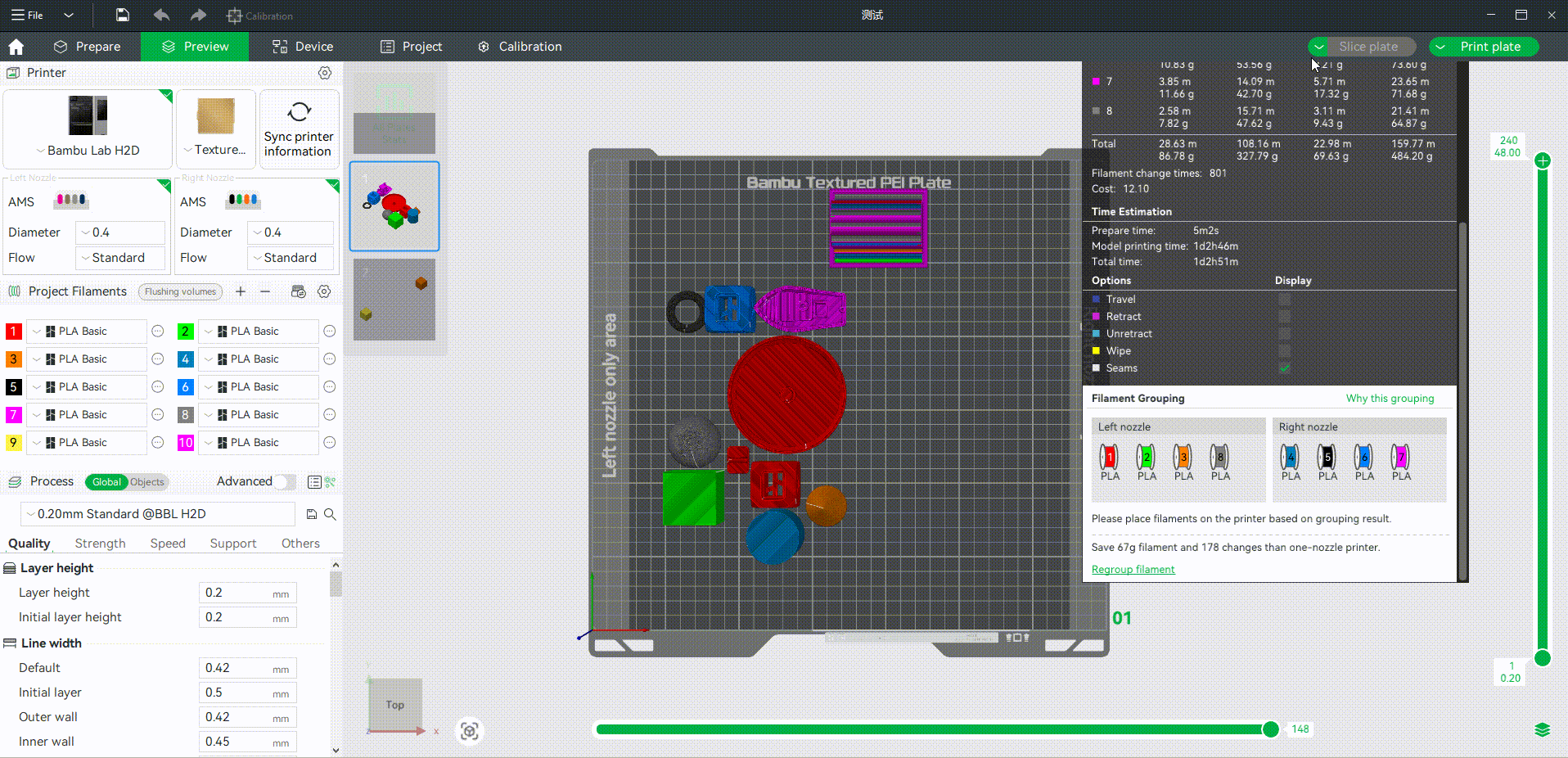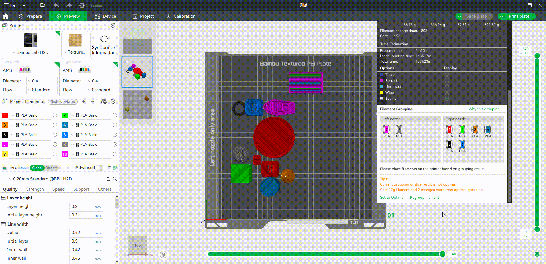 Lưu ý: Vì logic phân nhóm có xu hướng ưu tiên giảm lượng nhựa xả hơn là chọn màu sắc gần giống nhất, nên sau khi cắt lớp, bạn cần kiểm tra xem các sợi nhựa đã được đặt vào đúng AMS tương ứng của vòi phun trái/phải theo bảng “Phân nhóm nhựa” (Filament Grouping) hay chưa, và điều chỉnh vị trí từng cuộn nhựa trong AMS cho phù hợp. Nếu không, sợi nhựa được tự động gán cho vòi phun có thể sẽ không chọn được trong cửa sổ gửi lệnh in (sending task window).