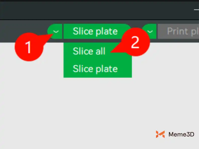 Chế độ cắt lớp đa bản in được kích hoạt bằng cách chọn mũi tên xuống bên cạnh nút “Slice Plate” (Cắt lớp bản in), sau đó chọn “Slice all” (Cắt lớp tất cả).