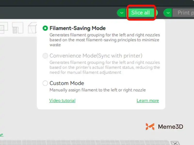 Bạn cũng có thể trực tiếp chọn “Chế độ tùy chỉnh” trong cửa sổ nổi của nút cắt lát, cho phép bạn tùy chỉnh nhóm sợi cắt lát cho vòi phun bên trái và bên phải trước khi cắt lát.