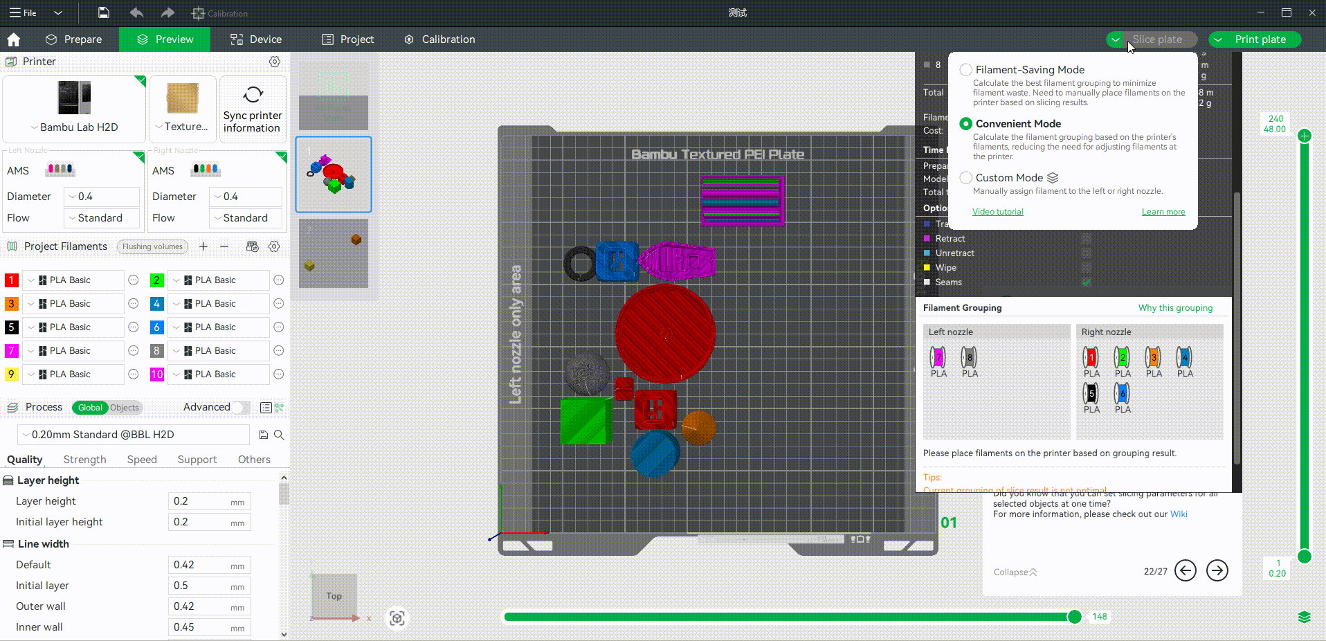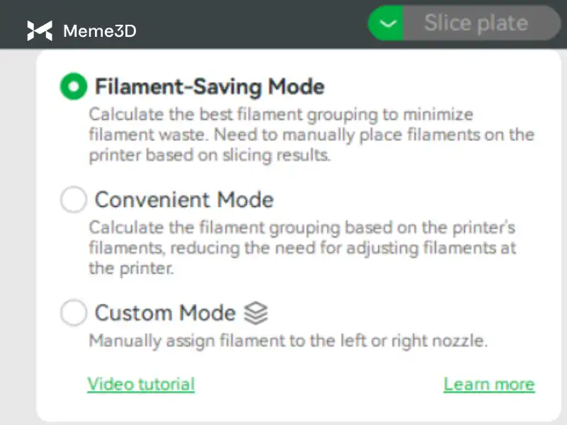 Chiến lược nhóm sợi nhựa mặc định được sử dụng trong Bambu Studio là chế độ tiết kiệm sợi in. Bạn có thể thấy tổng cộng 3 chế độ trong cửa sổ nổi của nút cắt lát (Slicing). Chọn “Chế độ tiết kiệm sợi in” và nhấp vào Cắt lát để có được nhóm sợi in tiết kiệm sợi nhất.