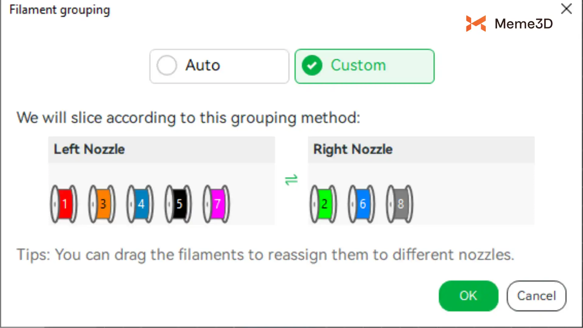 Giả sử bạn không hài lòng với hai chiến lược nhóm sợi tự động. Trong trường hợp đó, bạn có thể nhấp vào “Nhóm lại sợi” trong “Nhóm sợi”, sau đó điều chỉnh thủ công các sợi ở vòi phun bên trái và bên phải trong “Tùy chỉnh”.