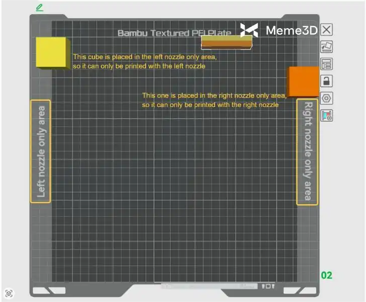 Do những giới hạn về mặt vật lý của máy in, các vòi phun khác nhau sẽ có giới hạn vùng in riêng biệt. Như trong hình dưới đây, khi một phần của mô hình sử dụng một loại nhựa cụ thể được đặt nằm trong vùng chỉ dành riêng cho vòi phun bên trái hoặc vòi phun bên phải, thì phần đó chỉ có thể được in bằng vòi phun tương ứng. Để biết thêm thông tin, vui lòng tham khảo bài viết wiki: Phạm vi in của vòi phun kép H2D. thông tin, vui lòng xem bài viết wiki về Phạm vi in của vòi phun kép H2D.