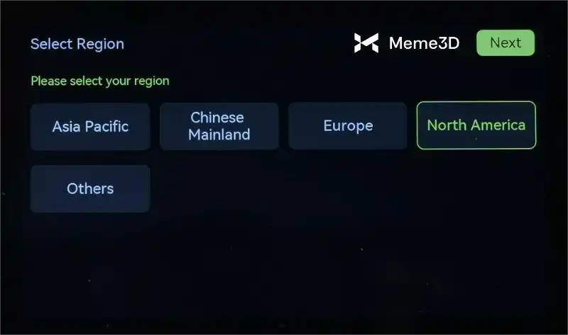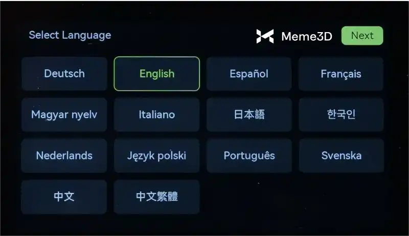 Sau khi đặt máy in vào vị trí cuối cùng, bạn có thể khởi động máy và bắt đầu các thiết lập ban đầu. Màn hình đầu tiên sẽ yêu cầu bạn chọn ngôn ngữ giao diện người dùng.