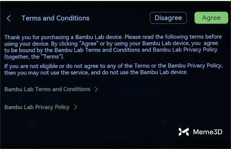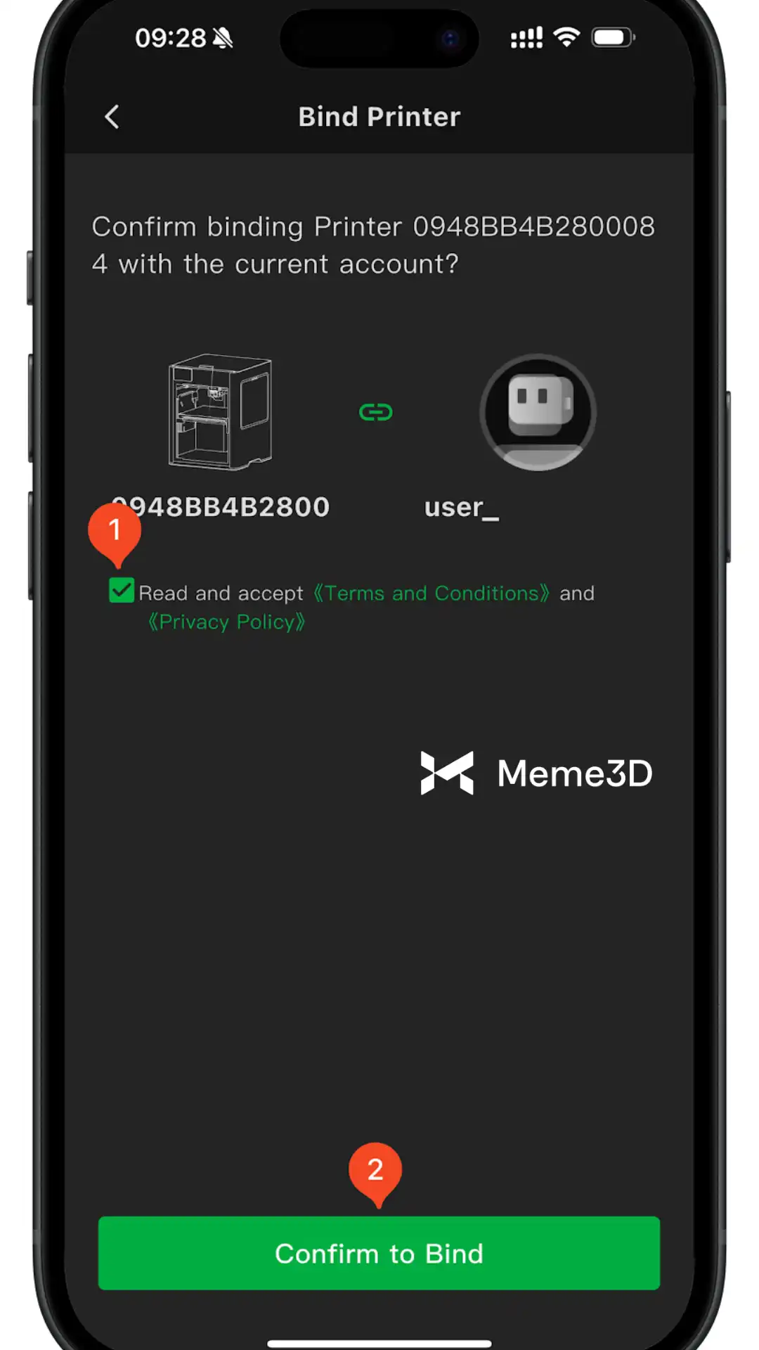 Sau khi quét xong, màn hình này sẽ hiển thị trong Bambu Handy, nơi bạn có thể xác nhận quá trình liên kết. Đọc và chấp nhận các điều khoản và điều kiện, sau đó nhấn Xác nhận để liên kết.