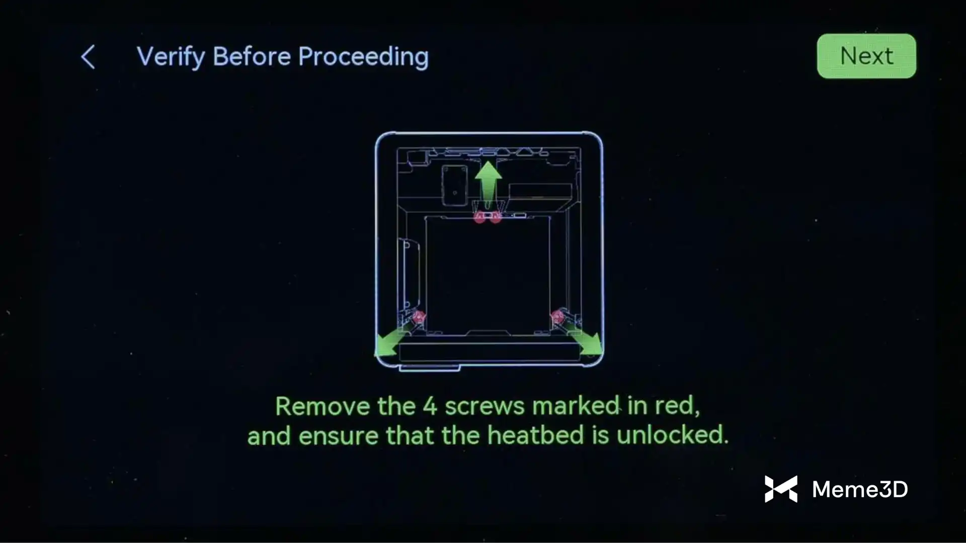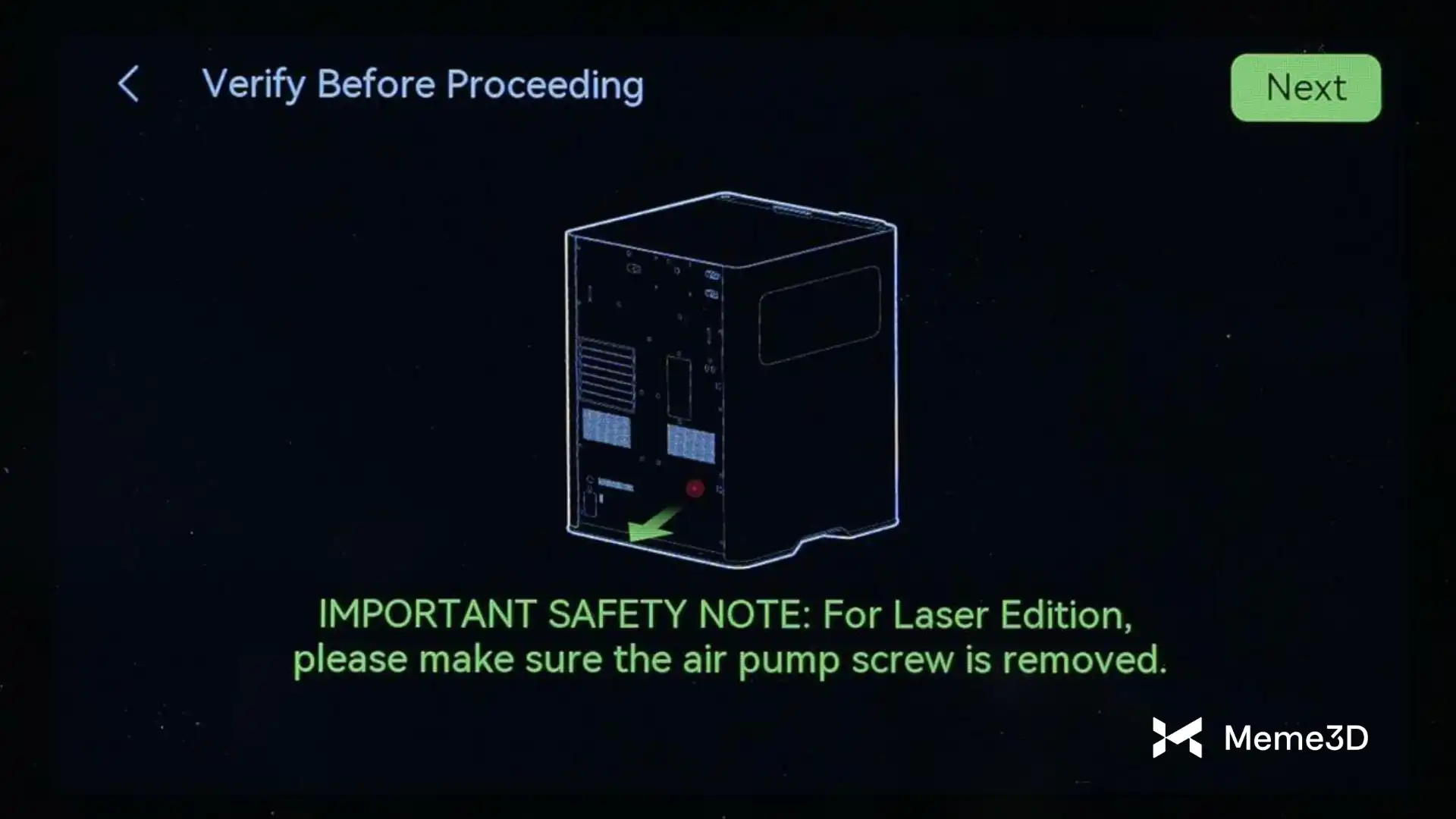 Tiếp theo, một lời nhắc nhở sẽ hiển thị trên màn hình liên quan đến phiên bản máy in H2D Laser Edition. Nếu bạn đã mua phiên bản này, hãy đảm bảo rằng bạn đã tháo vít bơm ở phía sau máy in. Bước này cũng được hướng dẫn trong Hướng dẫn Khởi động Nhanh.
