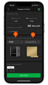 Tiếp theo, bạn cần kiểm tra kiểu máy in và loại bàn in được lắp đặt trên máy in của mình. Trong ví dụ này, đó là máy in H2S và bàn in PEI có bề mặt nhám . Trước khi in, hãy đảm bảo bàn in sạch sẽ nếu cần thiết, và luôn sử dụng bàn in tương thích với loại sợi in bạn đã chọn để đạt được kết quả tốt nhất.