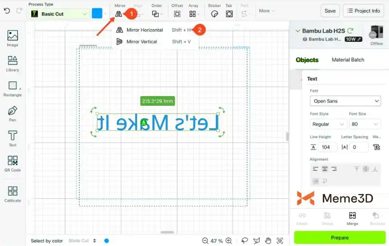 Chức năng Gương (Mirror) lật thiết kế của bạn theo chiều ngang hoặc chiều dọc, giống như nhìn vào hình ảnh phản chiếu. Ví dụ, nếu bạn đang cắt decal chuyển nhiệt cho áo phông, bạn cần lật ngược thiết kế trước khi cắt. Bằng cách này, khi bạn ép lên vải, văn bản hoặc logo sẽ hiển thị đúng chiều. Nếu không lật ngược, thiết kế cuối cùng sẽ bị ngược.
