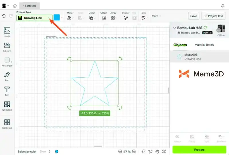 Chức năng Vẽ sử dụng công cụ bút để theo các đường nét thiết kế của bạn, giống như máy vẽ khổ lớn. Thay vì cắt, máy sẽ “vẽ” trực tiếp lên vật liệu.