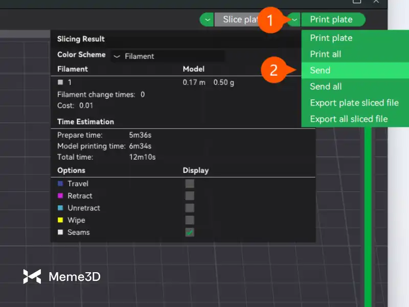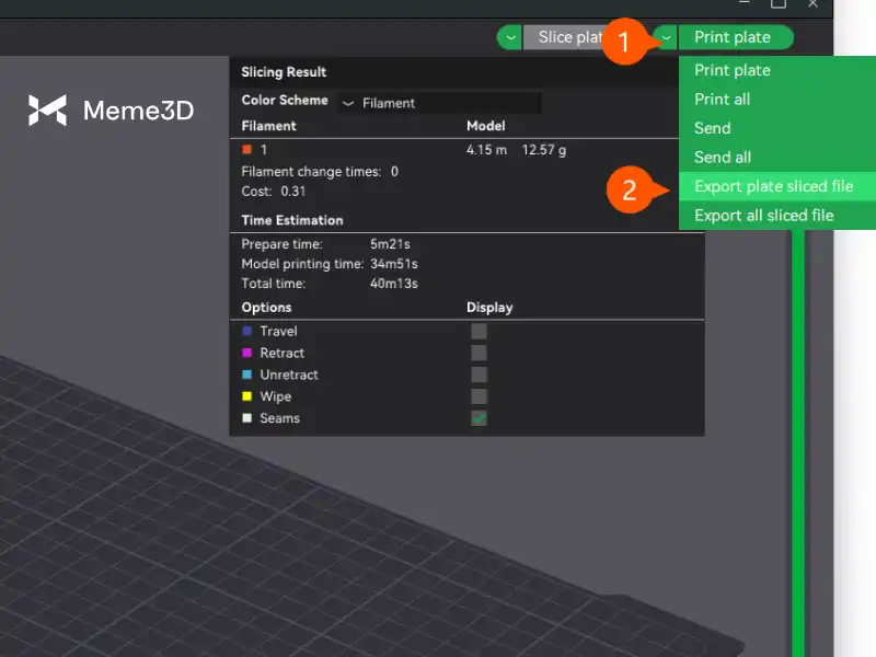 Sau khi áp dụng các thiết lập, hãy nhấp vào “Slice plate” sau khi chọn tùy chọn cắt lát để tạo tệp .gcode.