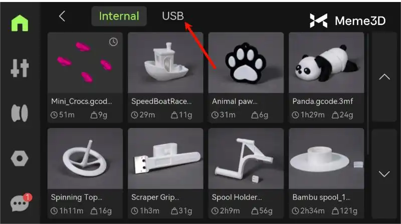 Duyệt qua danh sách các tệp trên USB và chọn tệp .gcode mà bạn đã chuyển, sau đó bắt đầu quá trình in.
