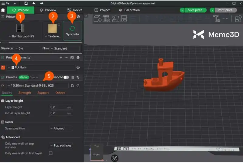 Sử dụng phần mềm Bambu Studio trên máy tính của bạn để nhập mô hình 3D (ví dụ: ở định dạng .STL hoặc .3MF). Sau khi nhập tệp vào Bambu Studio, bước tiếp theo là áp dụng các thiết lập cần thiết. Các thiết lập cơ bản bạn cần áp dụng được hiển thị bên dưới.