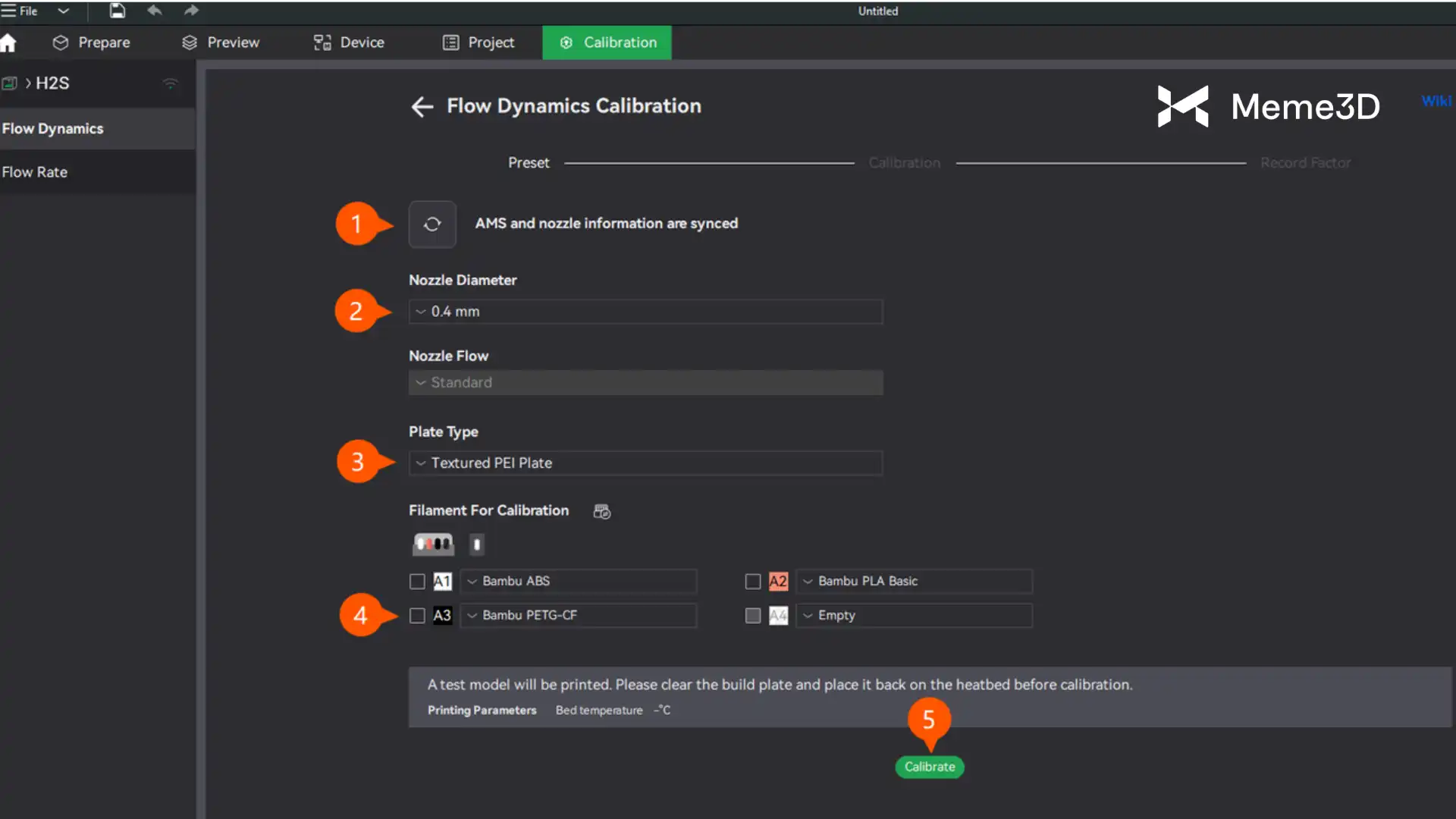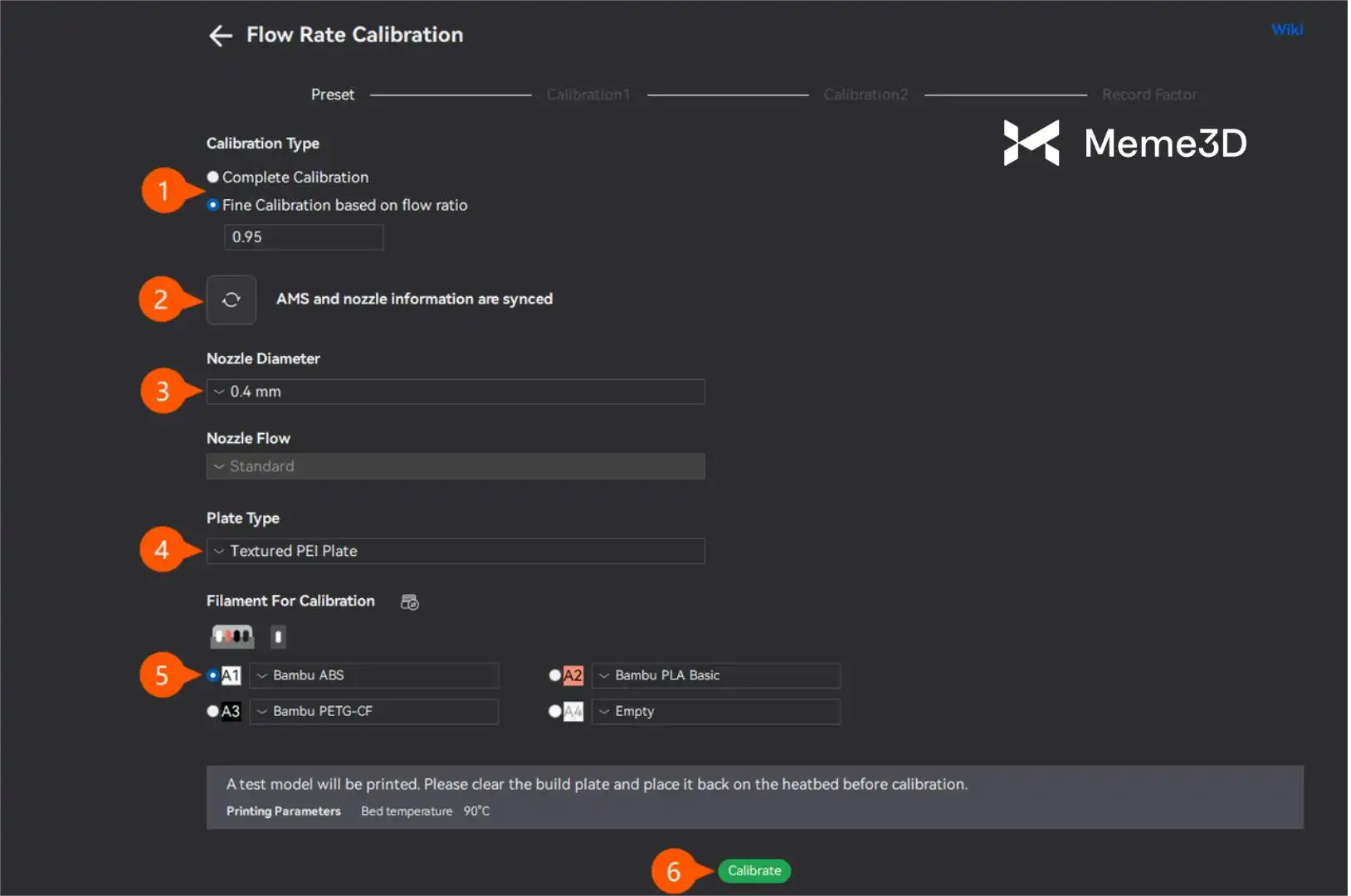 - Chọn loại dây tóc dùng để hiệu chuẩn, trong trường hợp này là Bambu ABS.