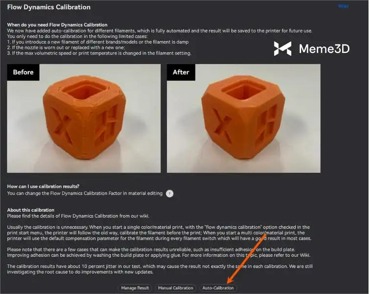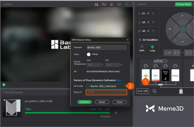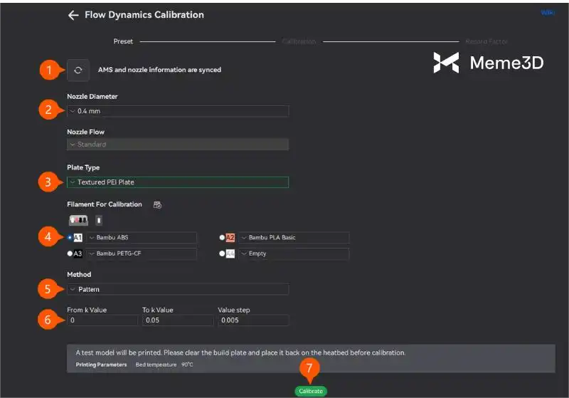 - Tự động hiệu chuẩn: Đây là phương pháp động lực dòng chảy nhanh nhất và dễ nhất. Ở chế độ này, bạn bắt đầu quá trình hiệu chuẩn, và các cảm biến của máy in sẽ phân tích bản in thử trong thời gian thực. Phần mềm sẽ tự động đề xuất giá trị K, sau đó bạn có thể áp dụng giá trị này. Vì quy trình hoàn toàn tự động, nên độ chính xác có thể thấp hơn đối với một số loại sợi in nhất định.