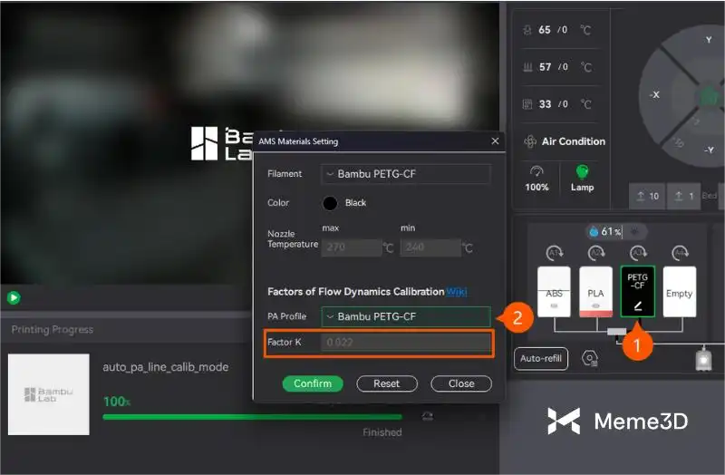 - Chọn loại dây tóc dùng để hiệu chuẩn, trong trường hợp này là Bambu PETG-CF.
